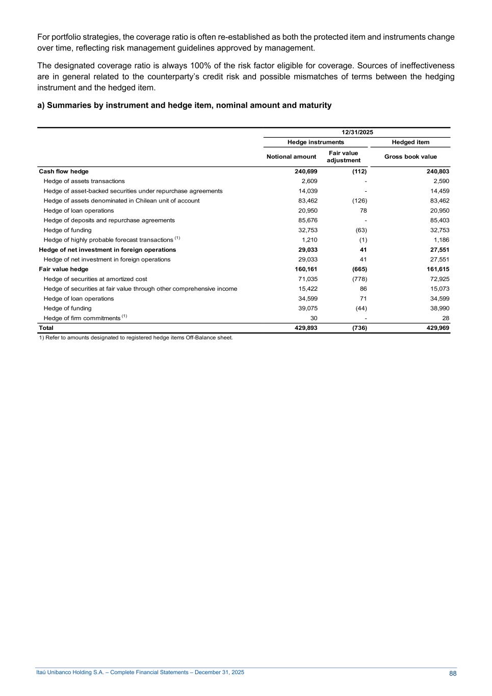 Itaú Unibanco Holding S.A. – Complete Financial Statements – December 31, 2025 For portfolio strategies, the coverage ratio is often re-established as both the protected item and instruments change over time, reflecting risk management guidelines approved by management. The designated coverage ratio is always 100% of the risk factor eligible for coverage. Sources of ineffectiveness are in general related to the counterparty’s credit risk and possible mismatches of terms between the hedging instrument and the hedged item. a) Summaries by instrument and hedge item, nominal amount and maturity 12/31/2025 Hedge instruments Hedged item Notional amount Fair value adjustment Gross book value Cash flow hedge 240,699 (112) 240,803 Hedge of assets transactions 2,609 - 2,590 Hedge of asset-backed securities under repurchase agreements 14,039 - 14,459 Hedge of assets denominated in Chilean unit of account 83,462 (126) 83,462 Hedge of loan operations 20,950 78 20,950 Hedge of deposits and repurchase agreements 85,676 - 85,403 Hedge of funding 32,753 (63) 32,753 Hedge of highly probable forecast transactions (1) 1,210 (1) 1,186 Hedge of net investment in foreign operations 29,033 41 27,551 Hedge of net investment in foreign operations 29,033 41 27,551 Fair value hedge 160,161 (665) 161,615 Hedge of securities at amortized cost 71,035 (778) 72,925 Hedge of securities at fair value through other comprehensive income 15,422 86 15,073 Hedge of loan operations 34,599 71 34,599 Hedge of funding 39,075 (44) 38,990 Hedge of firm commitments (1) 30 - 28 Total 429,893 (736) 429,969 1) Refer to amounts designated to registered hedge items Off-Balance sheet. 88