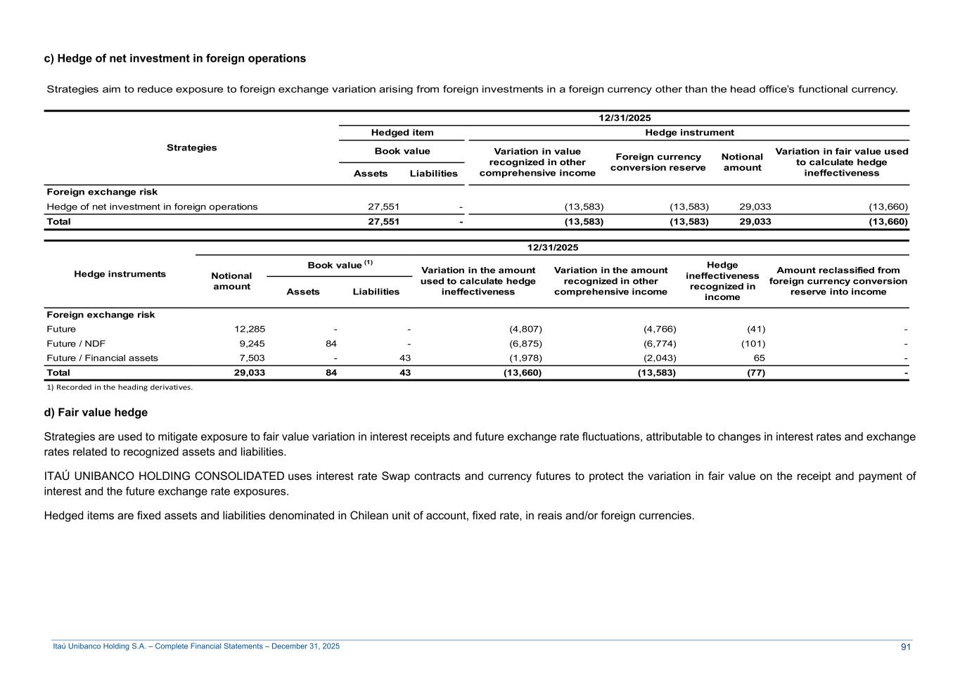 Itaú Unibanco Holding S.A. – Complete Financial Statements – December 31, 2025 c) Hedge of net investment in foreign operations Strategies aim to reduce exposure to foreign exchange variation arising from foreign investments in a foreign currency other than the head office’s functional currency. Strategies 12/31/2025 Hedged item Hedge instrument Book value Variation in value recognized in other comprehensive income Foreign currency conversion reserve Notional amount Variation in fair value used to calculate hedge ineffectivenessAssets Liabilities Foreign exchange risk Hedge of net investment in foreign operations 27,551 - (13,583) (13,583) 29,033 (13,660) Total 27,551 - (13,583) (13,583) 29,033 (13,660) Hedge instruments 12/31/2025 Notional amount Book value (1) Variation in the amount used to calculate hedge ineffectiveness Variation in the amount recognized in other comprehensive income Hedge ineffectiveness recognized in income Amount reclassified from foreign currency conversion reserve into incomeAssets Liabilities Foreign exchange risk Future 12,285 - - (4,807) (4,766) (41) - Future / NDF 9,245 84 - (6,875) (6,774) (101) - Future / Financial assets 7,503 - 43 (1,978) (2,043) 65 - Total 29,033 84 43 (13,660) (13,583) (77) - 1) Recorded in the heading derivatives. d) Fair value hedge Strategies are used to mitigate exposure to fair value variation in interest receipts and future exchange rate fluctuations, attributable to changes in interest rates and exchange rates related to recognized assets and liabilities. ITAÚ UNIBANCO HOLDING CONSOLIDATED uses interest rate Swap contracts and currency futures to protect the variation in fair value on the receipt and payment of interest and the future exchange rate exposures. Hedged items are fixed assets and liabilities denominated in Chilean unit of account, fixed rate, in reais and/or foreign currencies. 91