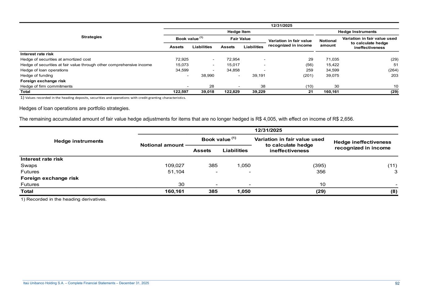 Itaú Unibanco Holding S.A. – Complete Financial Statements – December 31, 2025 Strategies 12/31/2025 Hedge Item Hedge Instruments Book value (1) Fair Value Variation in fair value recognized in income Notional amount Variation in fair value used to calculate hedge ineffectivenessAssets Liabilities Assets Liabilities Interest rate risk Hedge of securities at amortized cost 72,925 - 72,954 - 29 71,035 (29) Hedge of securities at fair value through other comprehensive income 15,073 - 15,017 - (56) 15,422 51 Hedge of loan operations 34,599 - 34,858 - 259 34,599 (264) Hedge of funding - 38,990 - 39,191 (201) 39,075 203 Foreign exchange risk Hedge of firm commitments - 28 - 38 (10) 30 10 Total 122,597 39,018 122,829 39,229 21 160,161 (29) 1) Values recorded in the heading deposits, securities and operations with credit granting characteristics. Hedges of loan operations are portfolio strategies. The remaining accumulated amount of fair value hedge adjustments for items that are no longer hedged is R$ 4,005, with effect on income of R$ 2,656. Hedge instruments 12/31/2025 Notional amount Book value (1) Variation in fair value used to calculate hedge ineffectiveness Hedge ineffectiveness recognized in incomeAssets Liabilities Interest rate risk Swaps 109,027 385 1,050 (395) (11) Futures 51,104 - - 356 3 Foreign exchange risk Futures 30 - - 10 - Total 160,161 385 1,050 (29) (8) 1) Recorded in the heading derivatives. 92