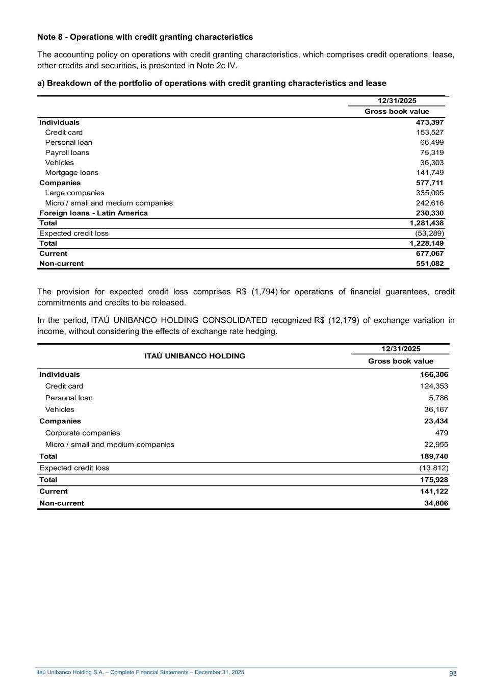 Itaú Unibanco Holding S.A. – Complete Financial Statements – December 31, 2025 Note 8 - Operations with credit granting characteristics The accounting policy on operations with credit granting characteristics, which comprises credit operations, lease, other credits and securities, is presented in Note 2c IV. a) Breakdown of the portfolio of operations with credit granting characteristics and lease 12/31/2025 Gross book value Individuals 473,397 Credit card 153,527 Personal loan 66,499 Payroll loans 75,319 Vehicles 36,303 Mortgage loans 141,749 Companies 577,711 Large companies 335,095 Micro / small and medium companies 242,616 Foreign loans - Latin America 230,330 Total 1,281,438 Expected credit loss (53,289) Total 1,228,149 Current 677,067 Non-current 551,082 The provision for expected credit loss comprises R$ (1,794) for operations of financial guarantees, credit commitments and credits to be released. In the period, ITAÚ UNIBANCO HOLDING CONSOLIDATED recognized R$ (12,179) of exchange variation in income, without considering the effects of exchange rate hedging. ITAÚ UNIBANCO HOLDING 12/31/2025 Gross book value Individuals 166,306 Credit card 124,353 Personal loan 5,786 Vehicles 36,167 Companies 23,434 Corporate companies 479 Micro / small and medium companies 22,955 Total 189,740 Expected credit loss (13,812) Total 175,928 Current 141,122 Non-current 34,806 93