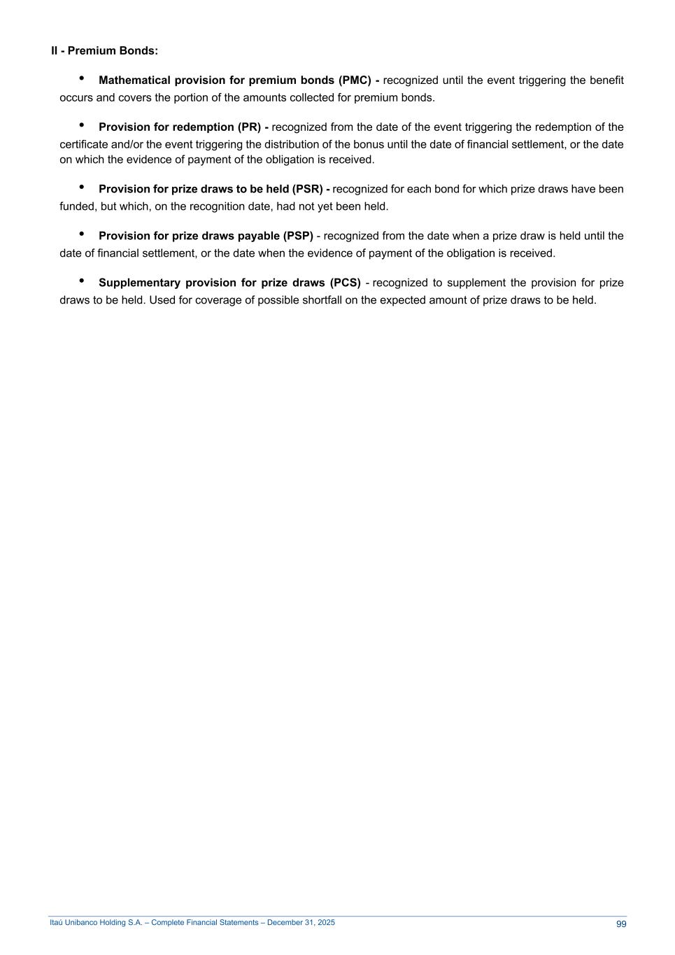 Itaú Unibanco Holding S.A. – Complete Financial Statements – December 31, 2025 II - Premium Bonds: • Mathematical provision for premium bonds (PMC) - recognized until the event triggering the benefit occurs and covers the portion of the amounts collected for premium bonds. • Provision for redemption (PR) - recognized from the date of the event triggering the redemption of the certificate and/or the event triggering the distribution of the bonus until the date of financial settlement, or the date on which the evidence of payment of the obligation is received. • Provision for prize draws to be held (PSR) - recognized for each bond for which prize draws have been funded, but which, on the recognition date, had not yet been held. • Provision for prize draws payable (PSP) - recognized from the date when a prize draw is held until the date of financial settlement, or the date when the evidence of payment of the obligation is received. • Supplementary provision for prize draws (PCS) - recognized to supplement the provision for prize draws to be held. Used for coverage of possible shortfall on the expected amount of prize draws to be held. 99