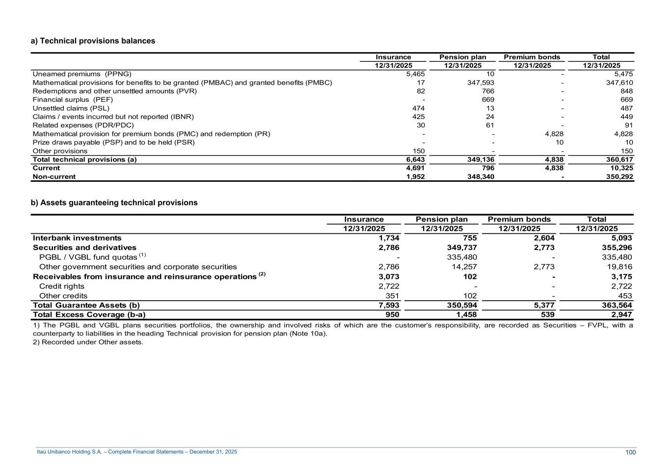 Itaú Unibanco Holding S.A. – Complete Financial Statements – December 31, 2025 a) Technical provisions balances Insurance Pension plan Premium bonds Total 12/31/2025 12/31/2025 12/31/2025 12/31/2025 Unearned premiums (PPNG) 5,465 10 - 5,475 Mathematical provisions for benefits to be granted (PMBAC) and granted benefits (PMBC) 17 347,593 - 347,610 Redemptions and other unsettled amounts (PVR) 82 766 - 848 Financial surplus (PEF) - 669 - 669 Unsettled claims (PSL) 474 13 - 487 Claims / events incurred but not reported (IBNR) 425 24 - 449 Related expenses (PDR/PDC) 30 61 - 91 Mathematical provision for premium bonds (PMC) and redemption (PR) - - 4,828 4,828 Prize draws payable (PSP) and to be held (PSR) - - 10 10 Other provisions 150 - - 150 Total technical provisions (a) 6,643 349,136 4,838 360,617 Current 4,691 796 4,838 10,325 Non-current 1,952 348,340 - 350,292 b) Assets guaranteeing technical provisions Insurance Pension plan Premium bonds Total 12/31/2025 12/31/2025 12/31/2025 12/31/2025 Interbank investments 1,734 755 2,604 5,093 Securities and derivatives 2,786 349,737 2,773 355,296 PGBL / VGBL fund quotas (1) - 335,480 - 335,480 Other government securities and corporate securities 2,786 14,257 2,773 19,816 Receivables from insurance and reinsurance operations (2) 3,073 102 - 3,175 Credit rights 2,722 - - 2,722 Other credits 351 102 - 453 Total Guarantee Assets (b) 7,593 350,594 5,377 363,564 Total Excess Coverage (b-a) 950 1,458 539 2,947 1) The PGBL and VGBL plans securities portfolios, the ownership and involved risks of which are the customer’s responsibility, are recorded as Securities – FVPL, with a counterparty to liabilities in the heading Technical provision for pension plan (Note 10a). 2) Recorded under Other assets. 100