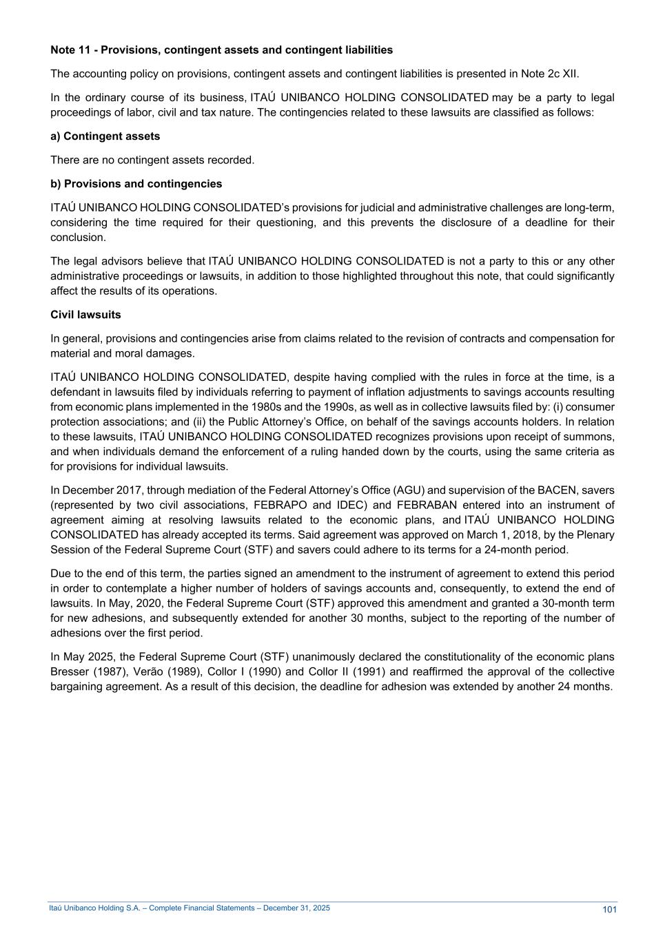 Itaú Unibanco Holding S.A. – Complete Financial Statements – December 31, 2025 Note 11 - Provisions, contingent assets and contingent liabilities The accounting policy on provisions, contingent assets and contingent liabilities is presented in Note 2c XII. In the ordinary course of its business, ITAÚ UNIBANCO HOLDING CONSOLIDATED may be a party to legal proceedings of labor, civil and tax nature. The contingencies related to these lawsuits are classified as follows: a) Contingent assets There are no contingent assets recorded. b) Provisions and contingencies ITAÚ UNIBANCO HOLDING CONSOLIDATED’s provisions for judicial and administrative challenges are long-term, considering the time required for their questioning, and this prevents the disclosure of a deadline for their conclusion. The legal advisors believe that ITAÚ UNIBANCO HOLDING CONSOLIDATED is not a party to this or any other administrative proceedings or lawsuits, in addition to those highlighted throughout this note, that could significantly affect the results of its operations. Civil lawsuits In general, provisions and contingencies arise from claims related to the revision of contracts and compensation for material and moral damages. ITAÚ UNIBANCO HOLDING CONSOLIDATED, despite having complied with the rules in force at the time, is a defendant in lawsuits filed by individuals referring to payment of inflation adjustments to savings accounts resulting from economic plans implemented in the 1980s and the 1990s, as well as in collective lawsuits filed by: (i) consumer protection associations; and (ii) the Public Attorney’s Office, on behalf of the savings accounts holders. In relation to these lawsuits, ITAÚ UNIBANCO HOLDING CONSOLIDATED recognizes provisions upon receipt of summons, and when individuals demand the enforcement of a ruling handed down by the courts, using the same criteria as for provisions for individual lawsuits. In December 2017, through mediation of the Federal Attorney’s Office (AGU) and supervision of the BACEN, savers (represented by two civil associations, FEBRAPO and IDEC) and FEBRABAN entered into an instrument of agreement aiming at resolving lawsuits related to the economic plans, and ITAÚ UNIBANCO HOLDING CONSOLIDATED has already accepted its terms. Said agreement was approved on March 1, 2018, by the Plenary Session of the Federal Supreme Court (STF) and savers could adhere to its terms for a 24-month period. Due to the end of this term, the parties signed an amendment to the instrument of agreement to extend this period in order to contemplate a higher number of holders of savings accounts and, consequently, to extend the end of lawsuits. In May, 2020, the Federal Supreme Court (STF) approved this amendment and granted a 30-month term for new adhesions, and subsequently extended for another 30 months, subject to the reporting of the number of adhesions over the first period. In May 2025, the Federal Supreme Court (STF) unanimously declared the constitutionality of the economic plans Bresser (1987), Verão (1989), Collor I (1990) and Collor II (1991) and reaffirmed the approval of the collective bargaining agreement. As a result of this decision, the deadline for adhesion was extended by another 24 months. 101