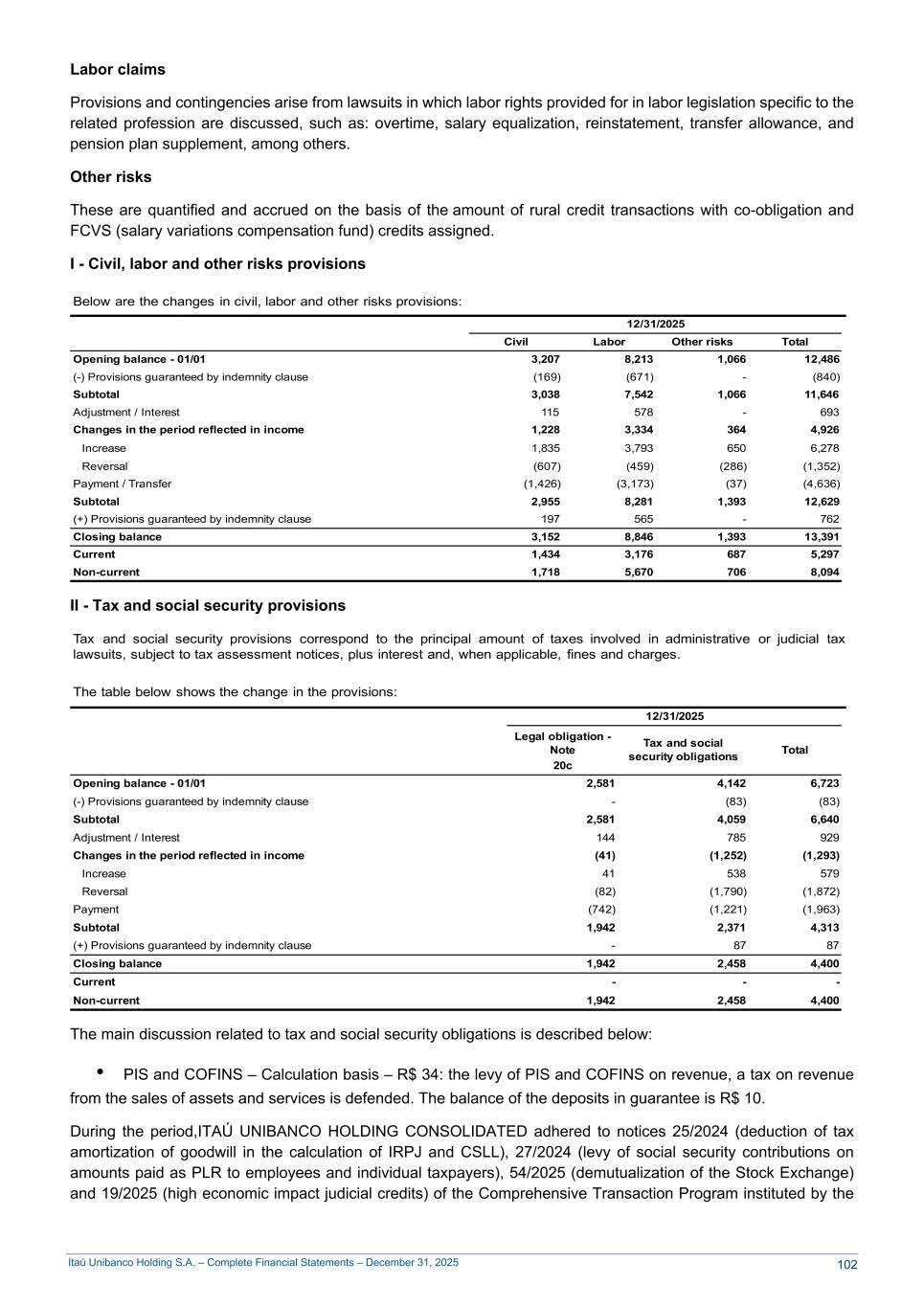 Itaú Unibanco Holding S.A. – Complete Financial Statements – December 31, 2025 Labor claims Provisions and contingencies arise from lawsuits in which labor rights provided for in labor legislation specific to the related profession are discussed, such as: overtime, salary equalization, reinstatement, transfer allowance, and pension plan supplement, among others. Other risks These are quantified and accrued on the basis of the amount of rural credit transactions with co-obligation and FCVS (salary variations compensation fund) credits assigned. I - Civil, labor and other risks provisions Below are the changes in civil, labor and other risks provisions: 01/01/2025 12/31/2025 01/01/2025 Civil Labor Other risks Total Opening balance - 01/01 3,207 8,213 1,066 12,486 (-) Provisions guaranteed by indemnity clause (169) (671) - (840) Subtotal 3,038 7,542 1,066 11,646 Adjustment / Interest 115 578 - 693 Changes in the period reflected in income 1,228 3,334 364 4,926 Increase 1,835 3,793 650 6,278 Reversal (607) (459) (286) (1,352) Payment / Transfer (1,426) (3,173) (37) (4,636) Subtotal 2,955 8,281 1,393 12,629 (+) Provisions guaranteed by indemnity clause 197 565 - 762 Closing balance 3,152 8,846 1,393 13,391 Current 1,434 3,176 687 5,297 Non-current 1,718 5,670 706 8,094 II - Tax and social security provisions Tax and social security provisions correspond to the principal amount of taxes involved in administrative or judicial tax lawsuits, subject to tax assessment notices, plus interest and, when applicable, fines and charges. The table below shows the change in the provisions: 01/01/2025 12/31/2025 01/01/2025 Legal obligation - Note Tax and social security obligations Total 20c Opening balance - 01/01 2,581 4,142 6,723 (-) Provisions guaranteed by indemnity clause - (83) (83) Subtotal 2,581 4,059 6,640 Adjustment / Interest 144 785 929 Changes in the period reflected in income (41) (1,252) (1,293) Increase 41 538 579 Reversal (82) (1,790) (1,872) Payment (742) (1,221) (1,963) Subtotal 1,942 2,371 4,313 (+) Provisions guaranteed by indemnity clause - 87 87 Closing balance 1,942 2,458 4,400 Current - - - Non-current 1,942 2,458 4,400 The main discussion related to tax and social security obligations is described below: • PIS and COFINS – Calculation basis – R$ 34: the levy of PIS and COFINS on revenue, a tax on revenue from the sales of assets and services is defended. The balance of the deposits in guarantee is R$ 10. During the period,ITAÚ UNIBANCO HOLDING CONSOLIDATED adhered to notices 25/2024 (deduction of tax amortization of goodwill in the calculation of IRPJ and CSLL), 27/2024 (levy of social security contributions on amounts paid as PLR to employees and individual taxpayers), 54/2025 (demutualization of the Stock Exchange) and 19/2025 (high economic impact judicial credits) of the Comprehensive Transaction Program instituted by the 102