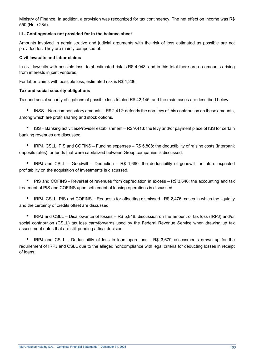 Itaú Unibanco Holding S.A. – Complete Financial Statements – December 31, 2025 Ministry of Finance. In addition, a provision was recognized for tax contingency. The net effect on income was R$ 550 (Note 28d). III - Contingencies not provided for in the balance sheet Amounts involved in administrative and judicial arguments with the risk of loss estimated as possible are not provided for. They are mainly composed of: Civil lawsuits and labor claims In civil lawsuits with possible loss, total estimated risk is R$ 4,043, and in this total there are no amounts arising from interests in joint ventures. For labor claims with possible loss, estimated risk is R$ 1,236. Tax and social security obligations Tax and social security obligations of possible loss totaled R$ 42,145, and the main cases are described below: • INSS – Non-compensatory amounts – R$ 2,412: defends the non-levy of this contribution on these amounts, among which are profit sharing and stock options. • ISS – Banking activities/Provider establishment – R$ 9,413: the levy and/or payment place of ISS for certain banking revenues are discussed. • IRPJ, CSLL, PIS and COFINS – Funding expenses – R$ 5,808: the deductibility of raising costs (Interbank deposits rates) for funds that were capitalized between Group companies is discussed. • IRPJ and CSLL – Goodwill – Deduction – R$ 1,690: the deductibility of goodwill for future expected profitability on the acquisition of investments is discussed. • PIS and COFINS - Reversal of revenues from depreciation in excess – R$ 3,646: the accounting and tax treatment of PIS and COFINS upon settlement of leasing operations is discussed. • IRPJ, CSLL, PIS and COFINS – Requests for offsetting dismissed - R$ 2,476: cases in which the liquidity and the certainty of credits offset are discussed. • IRPJ and CSLL – Disallowance of losses – R$ 5,848: discussion on the amount of tax loss (IRPJ) and/or social contribution (CSLL) tax loss carryforwards used by the Federal Revenue Service when drawing up tax assessment notes that are still pending a final decision. • IRPJ and CSLL - Deductibility of loss in loan operations - R$ 3,679: assessments drawn up for the requirement of IRPJ and CSLL due to the alleged noncompliance with legal criteria for deducting losses in receipt of loans. 103