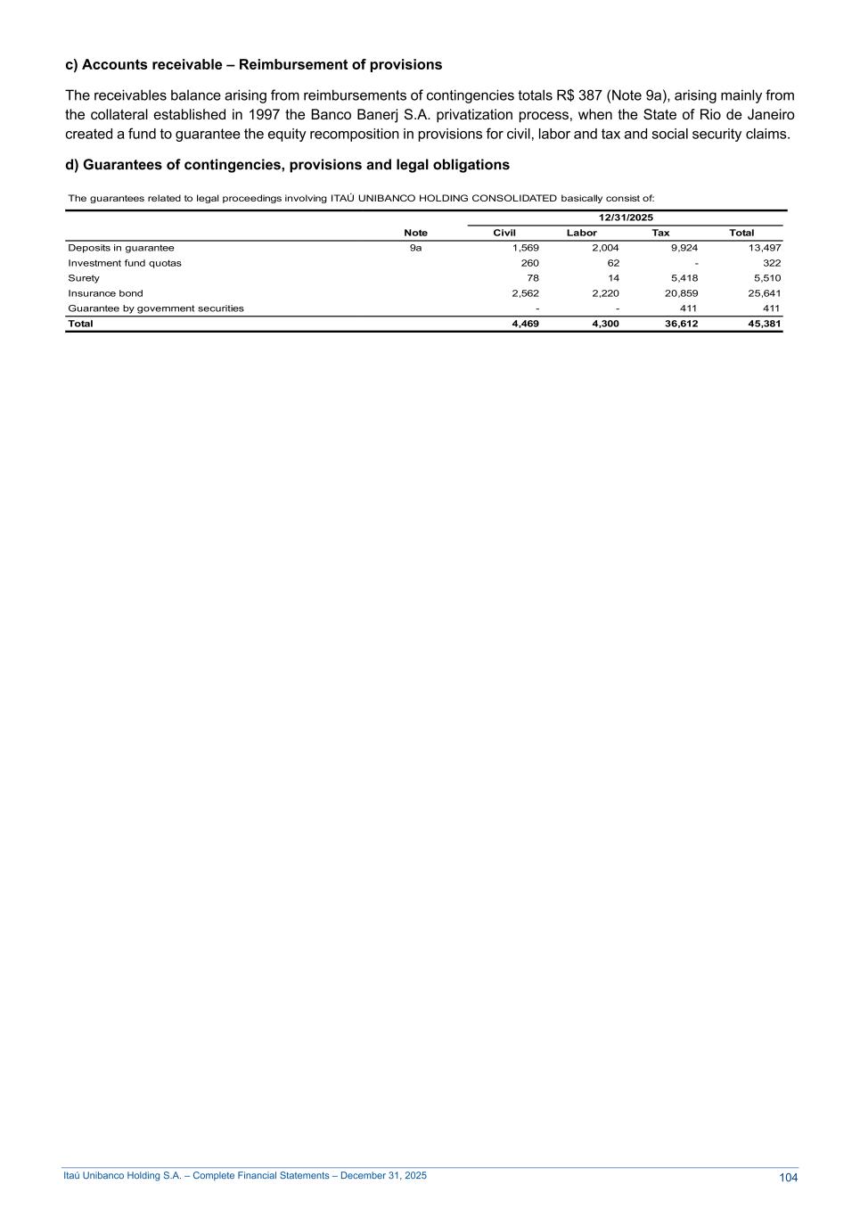 Itaú Unibanco Holding S.A. – Complete Financial Statements – December 31, 2025 c) Accounts receivable – Reimbursement of provisions The receivables balance arising from reimbursements of contingencies totals R$ 387 (Note 9a), arising mainly from the collateral established in 1997 the Banco Banerj S.A. privatization process, when the State of Rio de Janeiro created a fund to guarantee the equity recomposition in provisions for civil, labor and tax and social security claims. d) Guarantees of contingencies, provisions and legal obligations The guarantees related to legal proceedings involving ITAÚ UNIBANCO HOLDING CONSOLIDATED basically consist of: 12/31/2025 Note Civil Labor Tax Total Deposits in guarantee 9a 1,569 2,004 9,924 13,497 Investment fund quotas 260 62 - 322 Surety 78 14 5,418 5,510 Insurance bond 2,562 2,220 20,859 25,641 Guarantee by government securities - - 411 411 Total 4,469 4,300 36,612 45,381 104