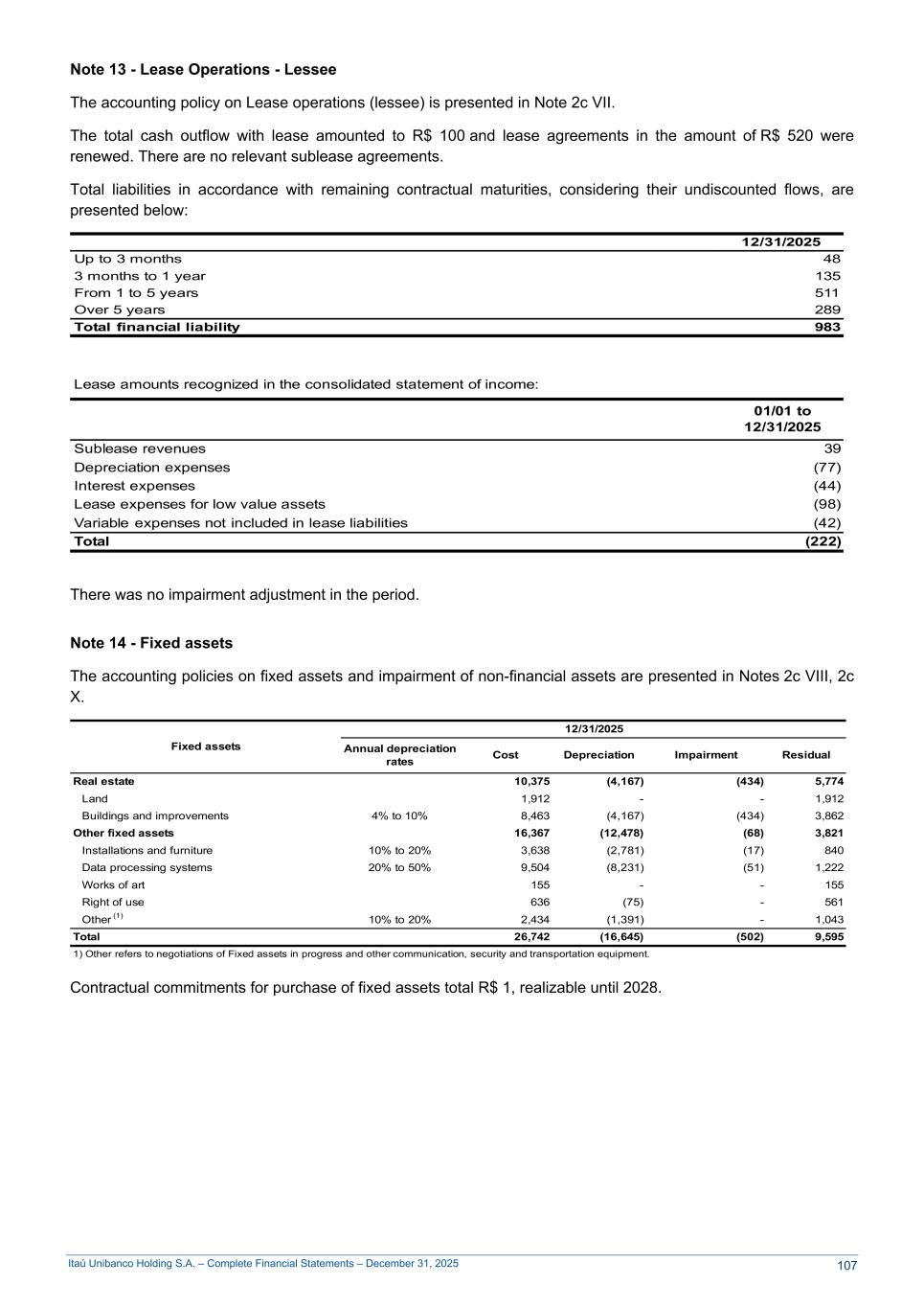 Itaú Unibanco Holding S.A. – Complete Financial Statements – December 31, 2025 Note 13 - Lease Operations - Lessee The accounting policy on Lease operations (lessee) is presented in Note 2c VII. The total cash outflow with lease amounted to R$ 100 and lease agreements in the amount of R$ 520 were renewed. There are no relevant sublease agreements. Total liabilities in accordance with remaining contractual maturities, considering their undiscounted flows, are presented below: 12/31/2025 Up to 3 months 48 3 months to 1 year 135 From 1 to 5 years 511 Over 5 years 289 Total financial liability 983 Lease amounts recognized in the consolidated statement of income: 01/01 to 12/31/2025 Sublease revenues 39 Depreciation expenses (77) Interest expenses (44) Lease expenses for low value assets (98) Variable expenses not included in lease liabilities (42) Total (222) There was no impairment adjustment in the period. Note 14 - Fixed assets The accounting policies on fixed assets and impairment of non-financial assets are presented in Notes 2c VIII, 2c X. Fixed assets 12/31/2025 Annual depreciation rates Cost Depreciation Impairment Residual Real estate 10,375 (4,167) (434) 5,774 Land 1,912 - - 1,912 Buildings and improvements 4% to 10% 8,463 (4,167) (434) 3,862 Other fixed assets 16,367 (12,478) (68) 3,821 Installations and furniture 10% to 20% 3,638 (2,781) (17) 840 Data processing systems 20% to 50% 9,504 (8,231) (51) 1,222 Works of art 155 - - 155 Right of use 636 (75) - 561 Other (1) 10% to 20% 2,434 (1,391) - 1,043 Total 26,742 (16,645) (502) 9,595 1) Other refers to negotiations of Fixed assets in progress and other communication, security and transportation equipment. Contractual commitments for purchase of fixed assets total R$ 1, realizable until 2028. 107