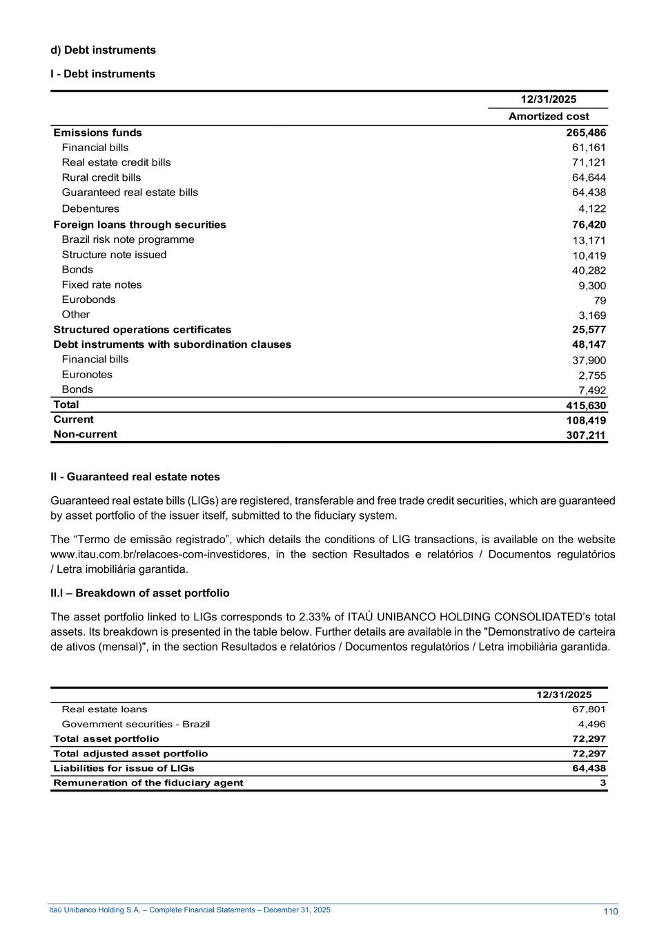 Itaú Unibanco Holding S.A. – Complete Financial Statements – December 31, 2025 d) Debt instruments I - Debt instruments 12/31/2025 Amortized cost Emissions funds 265,486 Financial bills 61,161 Real estate credit bills 71,121 Rural credit bills 64,644 Guaranteed real estate bills 64,438 Debentures 4,122 Foreign loans through securities 76,420 Brazil risk note programme 13,171 Structure note issued 10,419 Bonds 40,282 Fixed rate notes 9,300 Eurobonds 79 Other 3,169 Structured operations certificates 25,577 Debt instruments with subordination clauses 48,147 Financial bills 37,900 Euronotes 2,755 Bonds 7,492 Total 415,630 Current 108,419 Non-current 307,211 II - Guaranteed real estate notes Guaranteed real estate bills (LIGs) are registered, transferable and free trade credit securities, which are guaranteed by asset portfolio of the issuer itself, submitted to the fiduciary system. The “Termo de emissão registrado”, which details the conditions of LIG transactions, is available on the website www.itau.com.br/relacoes-com-investidores, in the section Resultados e relatórios / Documentos regulatórios / Letra imobiliária garantida. Il.l – Breakdown of asset portfolio The asset portfolio linked to LIGs corresponds to 2.33% of ITAÚ UNIBANCO HOLDING CONSOLIDATED’s total assets. Its breakdown is presented in the table below. Further details are available in the "Demonstrativo de carteira de ativos (mensal)", in the section Resultados e relatórios / Documentos regulatórios / Letra imobiliária garantida. 12/31/2025 Real estate loans 67,801 Government securities - Brazil 4,496 Total asset portfolio 72,297 Total adjusted asset portfolio 72,297 Liabilities for issue of LIGs 64,438 Remuneration of the fiduciary agent 3 110
