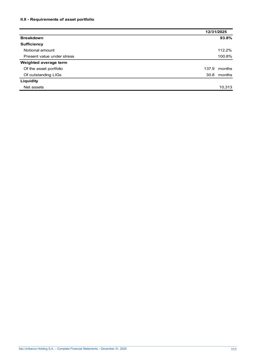 Itaú Unibanco Holding S.A. – Complete Financial Statements – December 31, 2025 II.II - Requirements of asset portfolio 12/31/2025 Breakdown 93.8% Sufficiency Notional amount 112.2% Present value under stress 100.8% Weighted average term Of the asset portfolio 137.9 months Of outstanding LIGs 30.8 months Liquidity Net assets 10,313 111