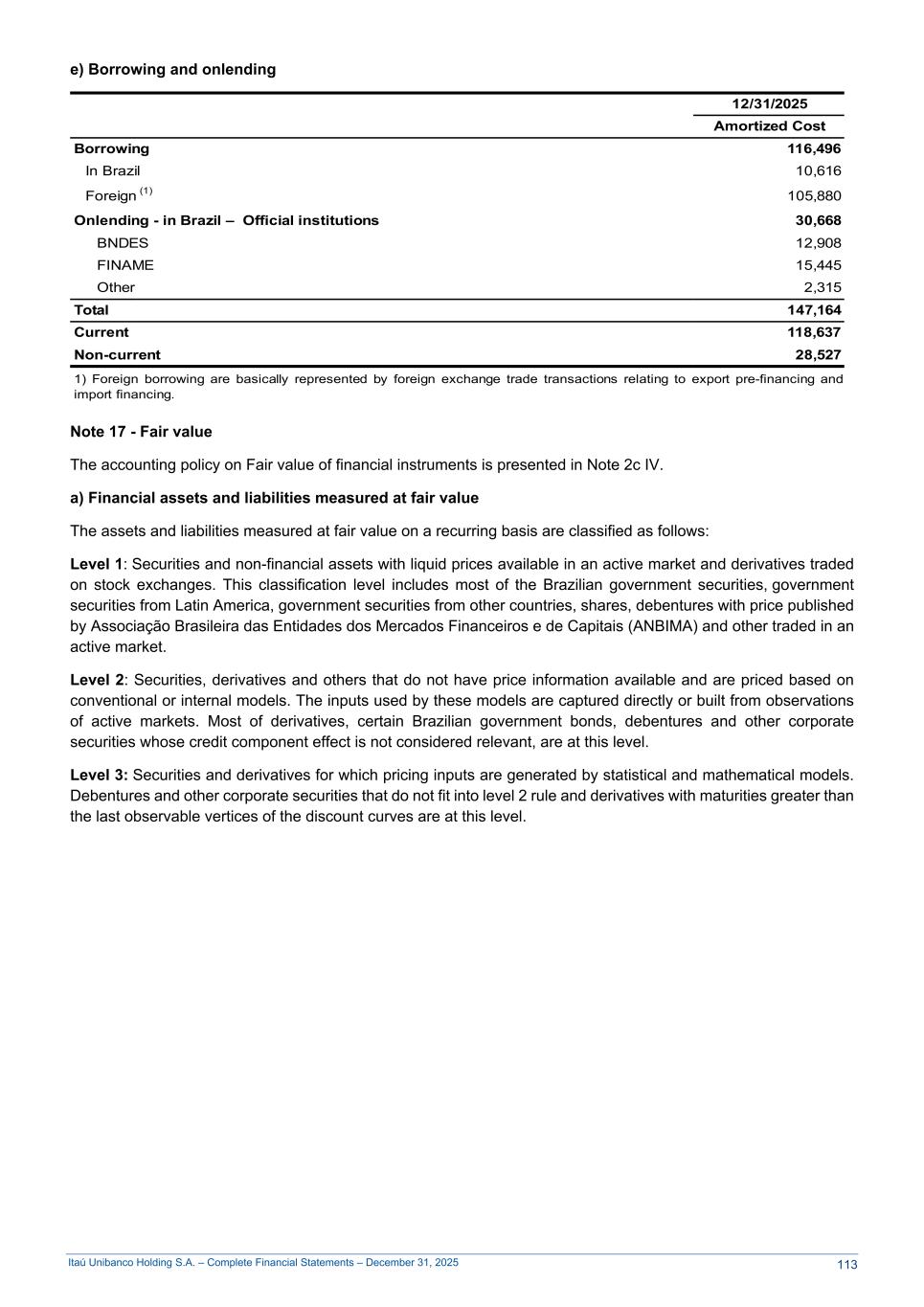 Itaú Unibanco Holding S.A. – Complete Financial Statements – December 31, 2025 e) Borrowing and onlending 12/31/2025 Amortized Cost Borrowing 116,496 In Brazil 10,616 Foreign (1) 105,880 Onlending - in Brazil – Official institutions 30,668 BNDES 12,908 FINAME 15,445 Other 2,315 Total 147,164 Current 118,637 Non-current 28,527 1) Foreign borrowing are basically represented by foreign exchange trade transactions relating to export pre-financing and import financing. Note 17 - Fair value The accounting policy on Fair value of financial instruments is presented in Note 2c IV. a) Financial assets and liabilities measured at fair value The assets and liabilities measured at fair value on a recurring basis are classified as follows: Level 1: Securities and non-financial assets with liquid prices available in an active market and derivatives traded on stock exchanges. This classification level includes most of the Brazilian government securities, government securities from Latin America, government securities from other countries, shares, debentures with price published by Associação Brasileira das Entidades dos Mercados Financeiros e de Capitais (ANBIMA) and other traded in an active market. Level 2: Securities, derivatives and others that do not have price information available and are priced based on conventional or internal models. The inputs used by these models are captured directly or built from observations of active markets. Most of derivatives, certain Brazilian government bonds, debentures and other corporate securities whose credit component effect is not considered relevant, are at this level. Level 3: Securities and derivatives for which pricing inputs are generated by statistical and mathematical models. Debentures and other corporate securities that do not fit into level 2 rule and derivatives with maturities greater than the last observable vertices of the discount curves are at this level. 113