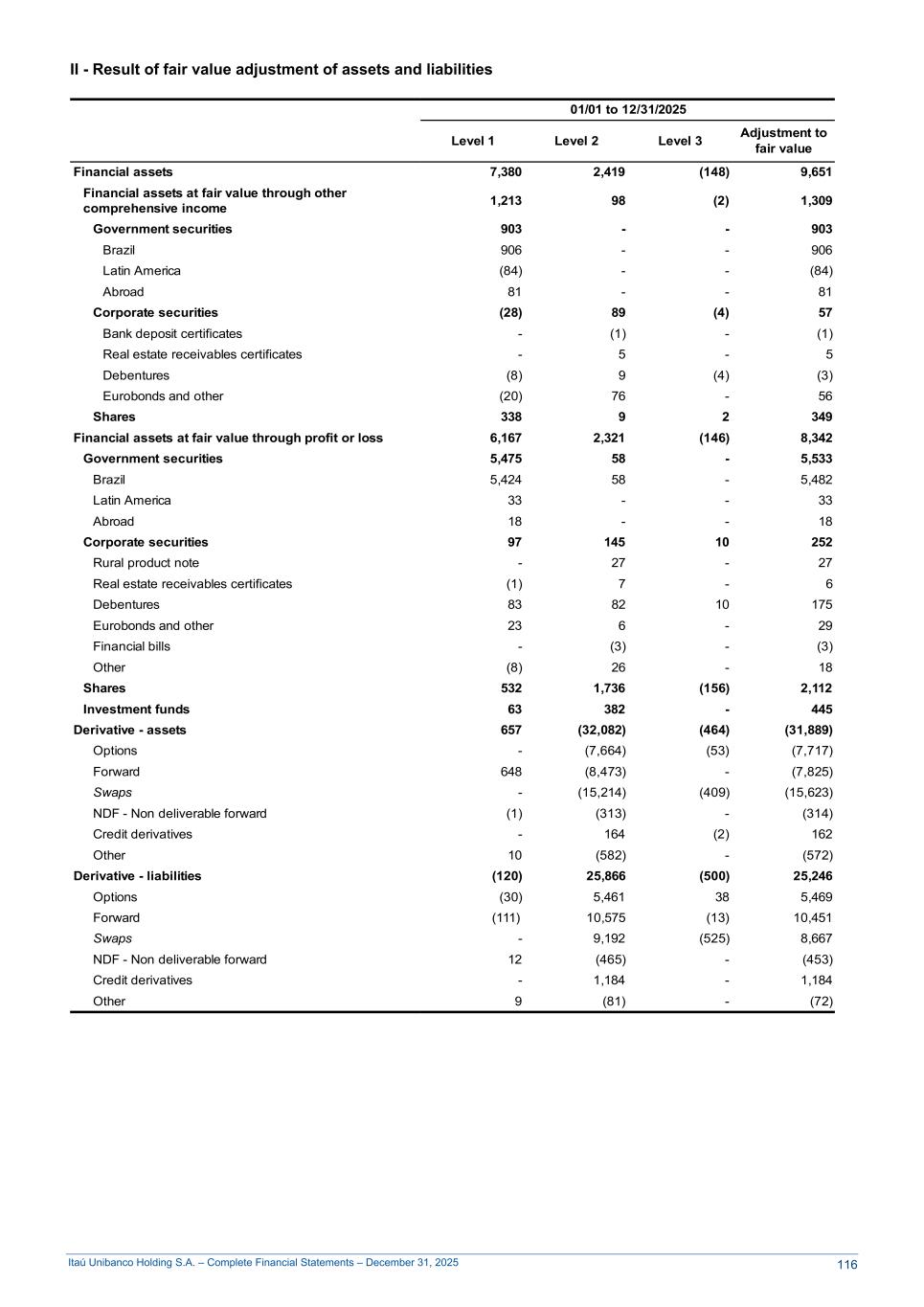 Itaú Unibanco Holding S.A. – Complete Financial Statements – December 31, 2025 II - Result of fair value adjustment of assets and liabilities 01/01 to 12/31/2025 Level 1 Level 2 Level 3 Adjustment to fair value Financial assets 7,380 2,419 (148) 9,651 Financial assets at fair value through other comprehensive income 1,213 98 (2) 1,309 Government securities 903 - - 903 Brazil 906 - - 906 Latin America (84) - - (84) Abroad 81 - - 81 Corporate securities (28) 89 (4) 57 Bank deposit certificates - (1) - (1) Real estate receivables certificates - 5 - 5 Debentures (8) 9 (4) (3) Eurobonds and other (20) 76 - 56 Shares 338 9 2 349 Financial assets at fair value through profit or loss 6,167 2,321 (146) 8,342 Government securities 5,475 58 - 5,533 Brazil 5,424 58 - 5,482 Latin America 33 - - 33 Abroad 18 - - 18 Corporate securities 97 145 10 252 Rural product note - 27 - 27 Real estate receivables certificates (1) 7 - 6 Debentures 83 82 10 175 Eurobonds and other 23 6 - 29 Financial bills - (3) - (3) Other (8) 26 - 18 Shares 532 1,736 (156) 2,112 Investment funds 63 382 - 445 Derivative - assets 657 (32,082) (464) (31,889) Options - (7,664) (53) (7,717) Forward 648 (8,473) - (7,825) Swaps - (15,214) (409) (15,623) NDF - Non deliverable forward (1) (313) - (314) Credit derivatives - 164 (2) 162 Other 10 (582) - (572) Derivative - liabilities (120) 25,866 (500) 25,246 Options (30) 5,461 38 5,469 Forward (111) 10,575 (13) 10,451 Swaps - 9,192 (525) 8,667 NDF - Non deliverable forward 12 (465) - (453) Credit derivatives - 1,184 - 1,184 Other 9 (81) - (72) 116