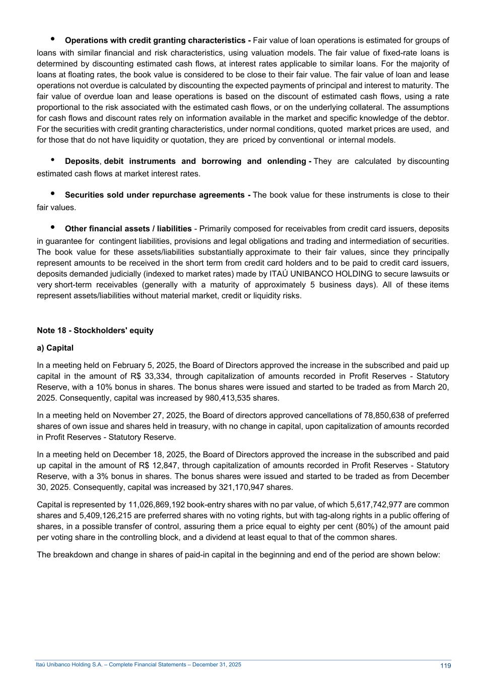 Itaú Unibanco Holding S.A. – Complete Financial Statements – December 31, 2025 • Operations with credit granting characteristics - Fair value of loan operations is estimated for groups of loans with similar financial and risk characteristics, using valuation models. The fair value of fixed-rate loans is determined by discounting estimated cash flows, at interest rates applicable to similar loans. For the majority of loans at floating rates, the book value is considered to be close to their fair value. The fair value of loan and lease operations not overdue is calculated by discounting the expected payments of principal and interest to maturity. The fair value of overdue loan and lease operations is based on the discount of estimated cash flows, using a rate proportional to the risk associated with the estimated cash flows, or on the underlying collateral. The assumptions for cash flows and discount rates rely on information available in the market and specific knowledge of the debtor. For the securities with credit granting characteristics, under normal conditions, quoted market prices are used, and for those that do not have liquidity or quotation, they are priced by conventional or internal models. • Deposits, debit instruments and borrowing and onlending - They are calculated by discounting estimated cash flows at market interest rates. • Securities sold under repurchase agreements - The book value for these instruments is close to their fair values. • Other financial assets / liabilities - Primarily composed for receivables from credit card issuers, deposits in guarantee for contingent liabilities, provisions and legal obligations and trading and intermediation of securities. The book value for these assets/liabilities substantially approximate to their fair values, since they principally represent amounts to be received in the short term from credit card holders and to be paid to credit card issuers, deposits demanded judicially (indexed to market rates) made by ITAÚ UNIBANCO HOLDING to secure lawsuits or very short-term receivables (generally with a maturity of approximately 5 business days). All of these items represent assets/liabilities without material market, credit or liquidity risks. Note 18 - Stockholders' equity a) Capital In a meeting held on February 5, 2025, the Board of Directors approved the increase in the subscribed and paid up capital in the amount of R$ 33,334, through capitalization of amounts recorded in Profit Reserves - Statutory Reserve, with a 10% bonus in shares. The bonus shares were issued and started to be traded as from March 20, 2025. Consequently, capital was increased by 980,413,535 shares. In a meeting held on November 27, 2025, the Board of directors approved cancellations of 78,850,638 of preferred shares of own issue and shares held in treasury, with no change in capital, upon capitalization of amounts recorded in Profit Reserves - Statutory Reserve. In a meeting held on December 18, 2025, the Board of Directors approved the increase in the subscribed and paid up capital in the amount of R$ 12,847, through capitalization of amounts recorded in Profit Reserves - Statutory Reserve, with a 3% bonus in shares. The bonus shares were issued and started to be traded as from December 30, 2025. Consequently, capital was increased by 321,170,947 shares. Capital is represented by 11,026,869,192 book-entry shares with no par value, of which 5,617,742,977 are common shares and 5,409,126,215 are preferred shares with no voting rights, but with tag-along rights in a public offering of shares, in a possible transfer of control, assuring them a price equal to eighty per cent (80%) of the amount paid per voting share in the controlling block, and a dividend at least equal to that of the common shares. The breakdown and change in shares of paid-in capital in the beginning and end of the period are shown below: 119