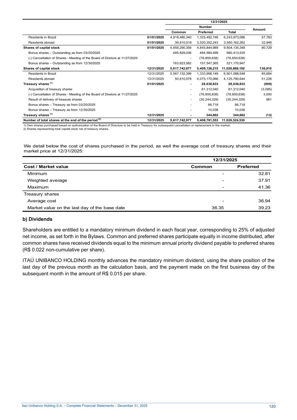 Itaú Unibanco Holding S.A. – Complete Financial Statements – December 31, 2025 01/01/2025 12/31/2025 01/01/2025 Number Amount Common Preferred Total Residents in Brazil 01/01/2025 4,918,480,340 1,325,492,746 6,243,973,086 57,783 Residents abroad 01/01/2025 39,810,019 3,520,352,243 3,560,162,262 32,946 Shares of capital stock 01/01/2025 4,958,290,359 4,845,844,989 9,804,135,348 90,729 Bonus shares – Outstanding as from 03/20/2025 495,829,036 484,584,499 980,413,535 (-) Cancellation of Shares - Meeting of the Board of Diretors at 11/27/2025 - (78,850,638) (78,850,638) Bonus shares – Outstanding as from 12/30/2025 163,623,582 157,547,365 321,170,947 Shares of capital stock 12/31/2025 5,617,742,977 5,409,126,215 11,026,869,192 136,910 Residents in Brazil 12/31/2025 5,567,132,399 1,333,956,149 6,901,088,548 85,684 Residents abroad 12/31/2025 50,610,578 4,075,170,066 4,125,780,644 51,226 Treasury shares (1) 01/01/2025 - 28,030,833 28,030,833 (909) Acquisition of treasury shares - 81,312,040 81,312,040 (3,085) (-) Cancellation of Shares - Meeting of the Board of Diretors at 11/27/2025 - (78,850,638) (78,850,638) 3,000 Result of delivery of treasure shares - (30,244,329) (30,244,329) 981 Bonus shares – Treasury as from 03/20/2025 - 86,718 86,718 Bonus shares – Treasury as from 12/30/2025 - 10,038 10,038 Treasury shares (1) 12/31/2025 - 344,662 344,662 (13) Number of total shares at the end of the period (2) 12/31/2025 5,617,742,977 5,408,781,553 11,026,524,530 1) Own shares purchased based on authorization of the Board of Directors to be held in Treasury for subsequent cancellation or replacement in the market. 2) Shares representing total capital stock net of treasury shares. We detail below the cost of shares purchased in the period, as well the average cost of treasury shares and their market price at 12/31/2025: 12/31/2025 Cost / Market value Common Preferred Minimum - 32.81 Weighted average - 37.91 Maximum - 41.36 Treasury shares Average cost - 36.94 Market value on the last day of the base date 36.35 39.23 b) Dividends Shareholders are entitled to a mandatory minimum dividend in each fiscal year, corresponding to 25% of adjusted net income, as set forth in the Bylaws. Common and preferred shares participate equally in income distributed, after common shares have received dividends equal to the minimum annual priority dividend payable to preferred shares (R$ 0.022 non-cumulative per share). ITAÚ UNIBANCO HOLDING monthly advances the mandatory minimum dividend, using the share position of the last day of the previous month as the calculation basis, and the payment made on the first business day of the subsequent month in the amount of R$ 0.015 per share. 120