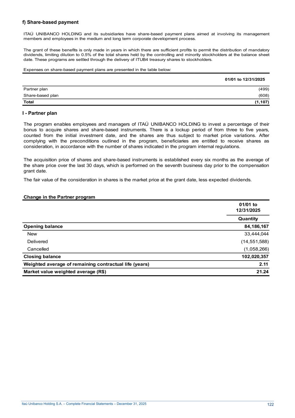 Itaú Unibanco Holding S.A. – Complete Financial Statements – December 31, 2025 f) Share-based payment ITAÚ UNIBANCO HOLDING and its subsidiaries have share-based payment plans aimed at involving its management members and employees in the medium and long term corporate development process. The grant of these benefits is only made in years in which there are sufficient profits to permit the distribution of mandatory dividends, limiting dilution to 0.5% of the total shares held by the controlling and minority stockholders at the balance sheet date. These programs are settled through the delivery of ITUB4 treasury shares to stockholders. Expenses on share-based payment plans are presented in the table below: 01/01 to 12/31/2025 Partner plan (499) Share-based plan (608) Total (1,107) I - Partner plan The program enables employees and managers of ITAÚ UNIBANCO HOLDING to invest a percentage of their bonus to acquire shares and share-based instruments. There is a lockup period of from three to five years, counted from the initial investment date, and the shares are thus subject to market price variations. After complying with the preconditions outlined in the program, beneficiaries are entitled to receive shares as consideration, in accordance with the number of shares indicated in the program internal regulations. The acquisition price of shares and share-based instruments is established every six months as the average of the share price over the last 30 days, which is performed on the seventh business day prior to the compensation grant date. The fair value of the consideration in shares is the market price at the grant date, less expected dividends. Change in the Partner program 01/01 to 12/31/2025 Quantity Opening balance 84,186,167 New 33,444,044 Delivered (14,551,588) Cancelled (1,058,266) Closing balance 102,020,357 Weighted average of remaining contractual life (years) 2.11 Market value weighted average (R$) 21.24 122