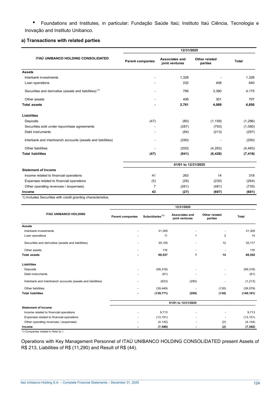 Itaú Unibanco Holding S.A. – Complete Financial Statements – December 31, 2025 • Foundations and Institutes, in particular: Fundação Saúde Itaú; Instituto Itaú Ciência, Tecnologia e Inovação and Instituto Unibanco. a) Transactions with related parties ITAÚ UNIBANCO HOLDING CONSOLIDATED 12/31/2025 Parent companies Associates and joint ventures Other related parties Total Assets lnterbank investments - 1,328 - 1,328 Loan operations - 232 408 640 Securities and derivative (assets and liabilities) (1) - 795 3,380 4,175 Other assets - 406 301 707 Total assets - 2,761 4,089 6,850 Liabilities Deposits (47) (80) (1,159) (1,286) Securities sold under repurchase agreements - (287) (793) (1,080) Debt instruments - (84) (213) (297) lnterbank and interbranch accounts (assets and liabilities) - (290) - (290) Other liabilities - (200) (4,263) (4,463) Total liabilities (47) (941) (6,428) (7,416) 01/01 to 12/31/2025 Statement of lncome lncome related to financial operations 41 263 14 318 Expenses related to financial operations (5) (29) (230) (264) Other operating revenues / (expenses) 7 (261) (481) (735) lncome 43 (27) (697) (681) 1) Includes Securities with credit granting characteristics. ITAÚ UNIBANCO HOLDING 12/31/2025 Parent companies Subsidiaries (1) Associates and joint ventures Other related parties Total Assets lnterbank investments - 31,305 - - 31,305 Loan operations - 11 1 2 14 Securities and derivative (assets and liabilities) - 35,105 - 12 35,117 Other assets - 116 - - 116 Total assets - 66,537 1 14 66,552 Liabilities Deposits - (99,318) - - (99,318) Debt instruments - (81) - - (81) lnterbank and interbranch accounts (assets and liabilities) - (923) (290) - (1,213) Other liabilities - (39,449) - (130) (39,579) Total liabilities - (139,771) (290) (130) (140,191) 01/01 to 12/31/2025 Statement of lncome lncome related to financial operations - 9,713 - - 9,713 Expenses related to financial operations - (13,151) - - (13,151) Other operating revenues / (expenses) - (4,142) - (2) (4,144) lncome - (7,580) - (2) (7,582) 1) Companies related in Note 2c I. Operations with Key Management Personnel of ITAÚ UNIBANCO HOLDING CONSOLIDATED present Assets of R$ 213, Liabilities of R$ (11,290) and Result of R$ (44). 124