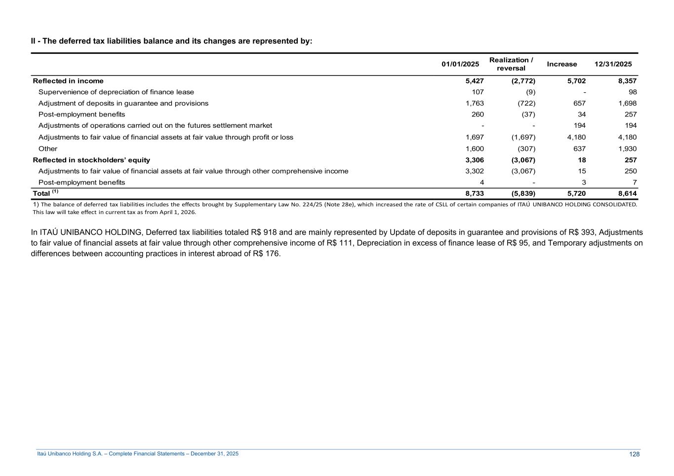 Itaú Unibanco Holding S.A. – Complete Financial Statements – December 31, 2025 II - The deferred tax liabilities balance and its changes are represented by: [@d9] 01/01/2025 Realization / reversal Increase 12/31/2025 Reflected in income 5,427 (2,772) 5,702 8,357 Supervenience of depreciation of finance lease 107 (9) - 98 Adjustment of deposits in guarantee and provisions 1,763 (722) 657 1,698 Post-employment benefits 260 (37) 34 257 Adjustments of operations carried out on the futures settlement market - - 194 194 Adjustments to fair value of financial assets at fair value through profit or loss 1,697 (1,697) 4,180 4,180 Other 1,600 (307) 637 1,930 Reflected in stockholders’ equity 3,306 (3,067) 18 257 Adjustments to fair value of financial assets at fair value through other comprehensive income 3,302 (3,067) 15 250 Post-employment benefits 4 - 3 7 Total (1) 8,733 (5,839) 5,720 8,614 1) The balance of deferred tax liabilities includes the effects brought by Supplementary Law No. 224/25 (Note 28e), which increased the rate of CSLL of certain companies of ITAÚ UNIBANCO HOLDING CONSOLIDATED. This law will take effect in current tax as from April 1, 2026. In ITAÚ UNIBANCO HOLDING, Deferred tax liabilities totaled R$ 918 and are mainly represented by Update of deposits in guarantee and provisions of R$ 393, Adjustments to fair value of financial assets at fair value through other comprehensive income of R$ 111, Depreciation in excess of finance lease of R$ 95, and Temporary adjustments on differences between accounting practices in interest abroad of R$ 176. 128