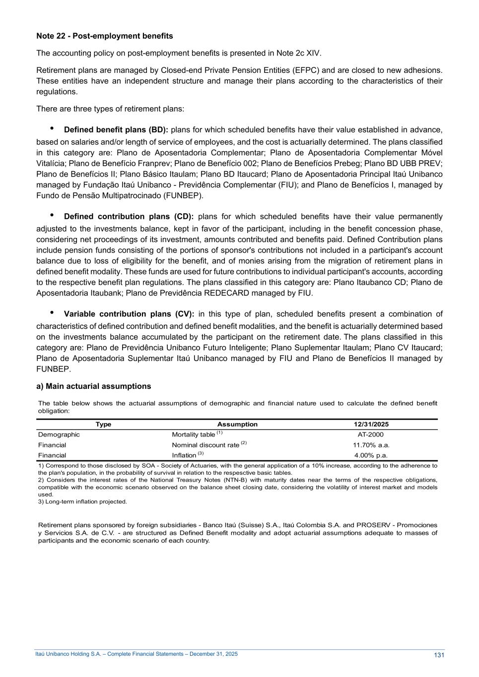 Itaú Unibanco Holding S.A. – Complete Financial Statements – December 31, 2025 Note 22 - Post-employment benefits The accounting policy on post-employment benefits is presented in Note 2c XIV. Retirement plans are managed by Closed-end Private Pension Entities (EFPC) and are closed to new adhesions. These entities have an independent structure and manage their plans according to the characteristics of their regulations. There are three types of retirement plans: • Defined benefit plans (BD): plans for which scheduled benefits have their value established in advance, based on salaries and/or length of service of employees, and the cost is actuarially determined. The plans classified in this category are: Plano de Aposentadoria Complementar; Plano de Aposentadoria Complementar Móvel Vitalícia; Plano de Benefício Franprev; Plano de Benefício 002; Plano de Benefícios Prebeg; Plano BD UBB PREV; Plano de Benefícios II; Plano Básico Itaulam; Plano BD Itaucard; Plano de Aposentadoria Principal Itaú Unibanco managed by Fundação Itaú Unibanco - Previdência Complementar (FIU); and Plano de Benefícios I, managed by Fundo de Pensão Multipatrocinado (FUNBEP). • Defined contribution plans (CD): plans for which scheduled benefits have their value permanently adjusted to the investments balance, kept in favor of the participant, including in the benefit concession phase, considering net proceedings of its investment, amounts contributed and benefits paid. Defined Contribution plans include pension funds consisting of the portions of sponsor's contributions not included in a participant's account balance due to loss of eligibility for the benefit, and of monies arising from the migration of retirement plans in defined benefit modality. These funds are used for future contributions to individual participant's accounts, according to the respective benefit plan regulations. The plans classified in this category are: Plano Itaubanco CD; Plano de Aposentadoria Itaubank; Plano de Previdência REDECARD managed by FIU. • Variable contribution plans (CV): in this type of plan, scheduled benefits present a combination of characteristics of defined contribution and defined benefit modalities, and the benefit is actuarially determined based on the investments balance accumulated by the participant on the retirement date. The plans classified in this category are: Plano de Previdência Unibanco Futuro Inteligente; Plano Suplementar Itaulam; Plano CV Itaucard; Plano de Aposentadoria Suplementar Itaú Unibanco managed by FIU and Plano de Benefícios II managed by FUNBEP. a) Main actuarial assumptions The table below shows the actuarial assumptions of demographic and financial nature used to calculate the defined benefit obligation: Type Assumption 12/31/2025 Demographic Mortality table (1) AT-2000 Financial Nominal discount rate (2) 11.70% a.a. Financial Inflation (3) 4.00% p.a. 1) Correspond to those disclosed by SOA - Society of Actuaries, with the general application of a 10% increase, according to the adherence to the plan's population, in the probability of survival in relation to the respesctive basic tables. 2) Considers the interest rates of the National Treasury Notes (NTN-B) with maturity dates near the terms of the respective obligations, compatible with the economic scenario observed on the balance sheet closing date, considering the volatility of interest market and models used. 3) Long-term inflation projected. Retirement plans sponsored by foreign subsidiaries - Banco Itaú (Suisse) S.A., Itaú Colombia S.A. and PROSERV - Promociones y Servicios S.A. de C.V. - are structured as Defined Benefit modality and adopt actuarial assumptions adequate to masses of participants and the economic scenario of each country. 131