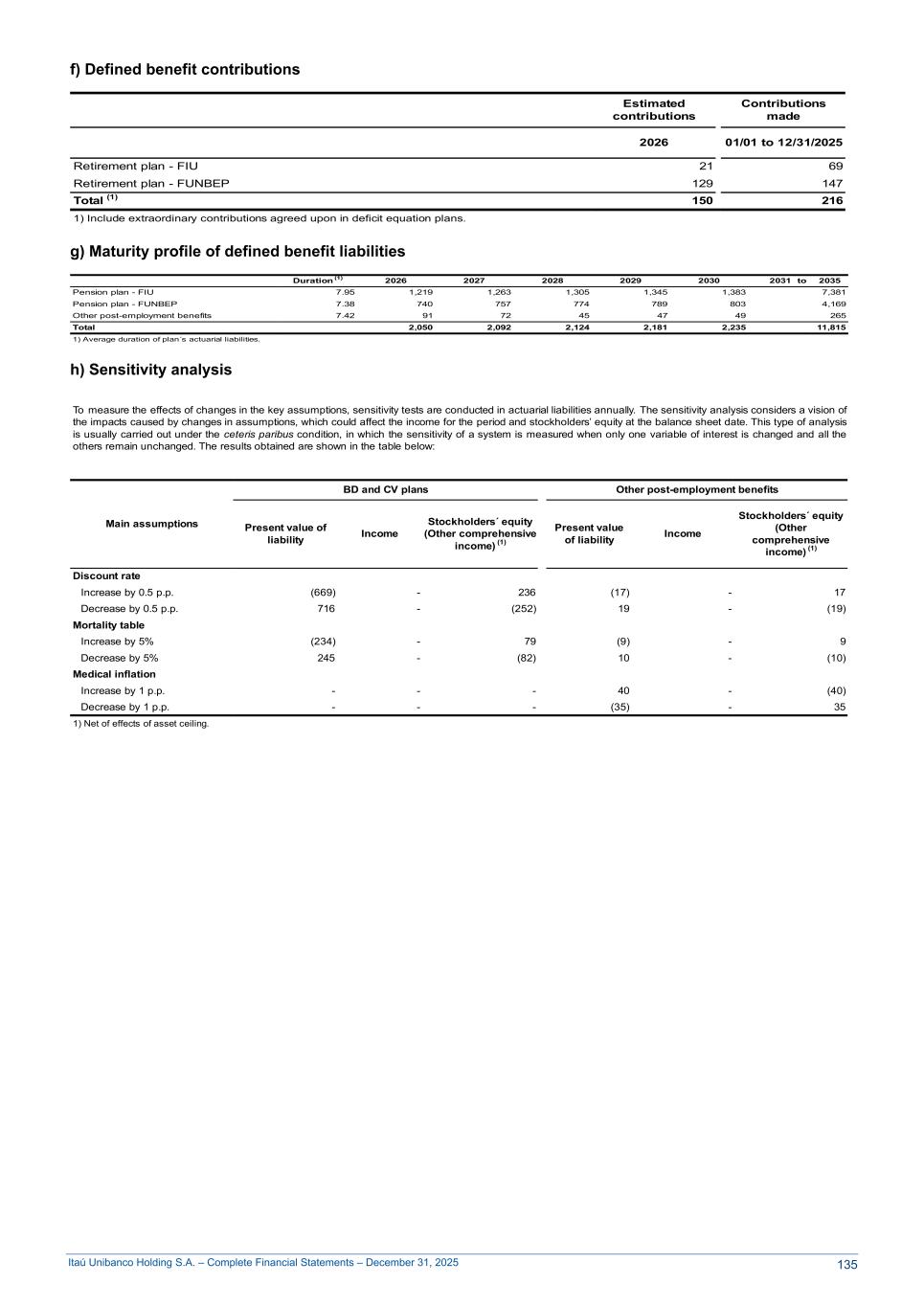 Itaú Unibanco Holding S.A. – Complete Financial Statements – December 31, 2025 f) Defined benefit contributions Estimated contributions Contributions made 2026 01/01 to 12/31/2025 Retirement plan - FIU 21 69 Retirement plan - FUNBEP 129 147 Total (1) 150 216 1) Include extraordinary contributions agreed upon in deficit equation plans. g) Maturity profile of defined benefit liabilities Duration (1) 2026 2027 2028 2029 2030 2031 to 2035 Pension plan - FIU 7.95 1,219 1,263 1,305 1,345 1,383 7,381 Pension plan - FUNBEP 7.38 740 757 774 789 803 4,169 Other post-employment benefits 7.42 91 72 45 47 49 265 Total 2,050 2,092 2,124 2,181 2,235 11,815 1) Average duration of plan´s actuarial liabilities. h) Sensitivity analysis To measure the effects of changes in the key assumptions, sensitivity tests are conducted in actuarial liabilities annually. The sensitivity analysis considers a vision of the impacts caused by changes in assumptions, which could affect the income for the period and stockholders’ equity at the balance sheet date. This type of analysis is usually carried out under the ceteris paribus condition, in which the sensitivity of a system is measured when only one variable of interest is changed and all the others remain unchanged. The results obtained are shown in the table below: Main assumptions BD and CV plans Other post-employment benefits Present value of liability Income Stockholders´ equity (Other comprehensive income) (1) Present value of liability Income Stockholders´ equity (Other comprehensive income) (1) Discount rate Increase by 0.5 p.p. (669) - 236 (17) - 17 Decrease by 0.5 p.p. 716 - (252) 19 - (19) Mortality table Increase by 5% (234) - 79 (9) - 9 Decrease by 5% 245 - (82) 10 - (10) Medical inflation Increase by 1 p.p. - - - 40 - (40) Decrease by 1 p.p. - - - (35) - 35 1) Net of effects of asset ceiling. 135