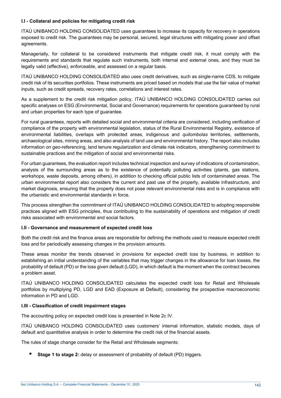 Itaú Unibanco Holding S.A. – Complete Financial Statements – December 31, 2025 I.I - Collateral and policies for mitigating credit risk ITAÚ UNIBANCO HOLDING CONSOLIDATED uses guarantees to increase its capacity for recovery in operations exposed to credit risk. The guarantees may be personal, secured, legal structures with mitigating power and offset agreements. Managerially, for collateral to be considered instruments that mitigate credit risk, it must comply with the requirements and standards that regulate such instruments, both internal and external ones, and they must be legally valid (effective), enforceable, and assessed on a regular basis. ITAÚ UNIBANCO HOLDING CONSOLIDATED also uses credit derivatives, such as single-name CDS, to mitigate credit risk of its securities portfolios. These instruments are priced based on models that use the fair value of market inputs, such as credit spreads, recovery rates, correlations and interest rates. As a supplement to the credit risk mitigation policy, ITAÚ UNIBANCO HOLDING CONSOLIDATED carries out specific analyses on ESG (Environmental, Social and Governance) requirements for operations guaranteed by rural and urban properties for each type of guarantee. For rural guarantees, reports with detailed social and environmental criteria are considered, including verification of compliance of the property with environmental legislation, status of the Rural Environmental Registry, existence of environmental liabilities, overlaps with protected areas, indigenous and quilombolas territories, settlements, archaeological sites, mining areas, and also analysis of land use and environmental history. The report also includes information on geo-referencing, land tenure regularization and climate risk indicators, strengthening commitment to sustainable practices and the mitigation of social and environmental risks. For urban guarantees, the evaluation report includes technical inspection and survey of indications of contamination, analysis of the surrounding areas as to the existence of potentially polluting activities (plants, gas stations, workshops, waste deposits, among others), in addition to checking official public lists of contaminated areas. The urban environmental report also considers the current and past use of the property, available infrastructure, and market diagnosis, ensuring that the property does not pose relevant environmental risks and is in compliance with the urbanistic and environmental standards in force. This process strengthen the commitment of ITAÚ UNIBANCO HOLDING CONSOLIDATED to adopting responsible practices aligned with ESG principles, thus contributing to the sustainability of operations and mitigation of credit risks associated with environmental and social factors. I.II - Governance and measurement of expected credit loss Both the credit risk and the finance areas are responsible for defining the methods used to measure expected credit loss and for periodically assessing changes in the provision amounts. These areas monitor the trends observed in provisions for expected credit loss by business, in addition to establishing an initial understanding of the variables that may trigger changes in the allowance for loan losses, the probability of default (PD) or the loss given default (LGD), in which default is the moment when the contract becomes a problem asset. ITAÚ UNIBANCO HOLDING CONSOLIDATED calculates the expected credit loss for Retail and Wholesale portfolios by multiplying PD, LGD and EAD (Exposure at Default), considering the prospective macroeconomic information in PD and LGD. I.III - Classification of credit impairment stages The accounting policy on expected credit loss is presented in Note 2c IV. ITAÚ UNIBANCO HOLDING CONSOLIDATED uses customers’ internal information, statistic models, days of default and quantitative analysis in order to determine the credit risk of the financial assets. The rules of stage change consider for the Retail and Wholesale segments: • Stage 1 to stage 2: delay or assessment of probability of default (PD) triggers. 142