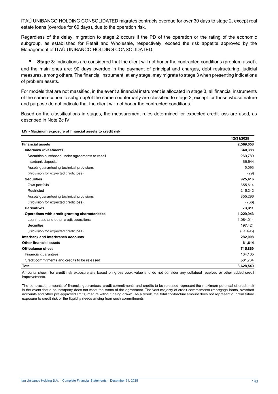 Itaú Unibanco Holding S.A. – Complete Financial Statements – December 31, 2025 ITAÚ UNIBANCO HOLDING CONSOLIDATED migrates contracts overdue for over 30 days to stage 2, except real estate loans (overdue for 60 days), due to the operation risk. Regardless of the delay, migration to stage 2 occurs if the PD of the operation or the rating of the economic subgroup, as established for Retail and Wholesale, respectively, exceed the risk appetite approved by the Management of ITAÚ UNIBANCO HOLDING CONSOLIDATED. • Stage 3: indications are considered that the client will not honor the contracted conditions (problem asset), and the main ones are: 90 days overdue in the payment of principal and charges, debt restructuring, judicial measures, among others. The financial instrument, at any stage, may migrate to stage 3 when presenting indications of problem assets. For models that are not massified, in the event a financial instrument is allocated in stage 3, all financial instruments of the same economic subgroup/of the same counterparty are classified to stage 3, except for those whose nature and purpose do not indicate that the client will not honor the contracted conditions. Based on the classifications in stages, the measurement rules determined for expected credit loss are used, as described in Note 2c IV. I.IV - Maximum exposure of financial assets to credit risk 12/31/2025 Financial assets 2,569,058 Interbank investments 340,388 Securities purchased under agreements to resell 269,780 Interbank deposits 65,544 Assets guaranteeing technical provisions 5,093 (Provision for expected credit loss) (29) Securities 925,416 Own portfolio 355,614 Restricted 215,242 Assets guaranteeing technical provisions 355,296 (Provision for expected credit loss) (736) Derivatives 73,311 Operations with credit granting characteristics 1,229,943 Loan, lease and other credit operations 1,084,014 Securities 197,424 (Provision for expected credit loss) (51,495) Interbank and interbranch accounts 282,008 Other financial assets 61,614 Off-balance sheet 715,869 Financial guarantees 134,105 Credit commitments and credits to be released 581,764 Total 3,628,549 Amounts shown for credit risk exposure are based on gross book value and do not consider any collateral received or other added credit improvements. The contractual amounts of financial guarantees, credit commitments and credits to be released represent the maximum potential of credit risk in the event that a counterparty does not meet the terms of the agreement. The vast majority of credit commitments (mortgage loans, overdraft accounts and other pre-approved limits) mature without being drawn. As a result, the total contractual amount does not represent our real future exposure to credit risk or the liquidity needs arising from such commitments. 143