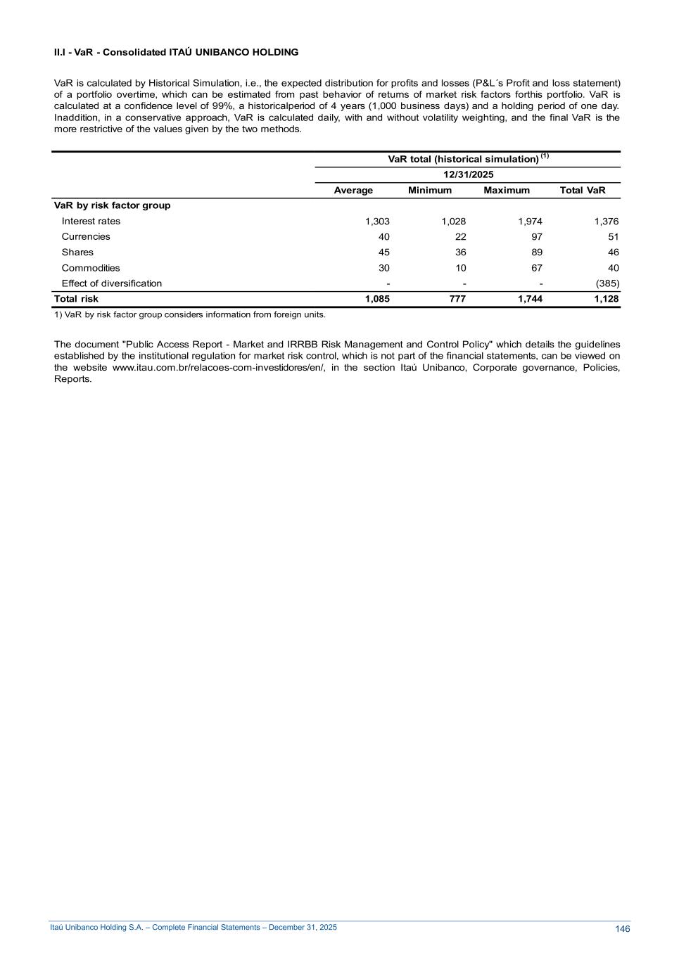 Itaú Unibanco Holding S.A. – Complete Financial Statements – December 31, 2025 II.I - VaR - Consolidated ITAÚ UNIBANCO HOLDING VaR is calculated by Historical Simulation, i.e., the expected distribution for profits and losses (P&L´s Profit and loss statement) of a portfolio overtime, which can be estimated from past behavior of returns of market risk factors forthis portfolio. VaR is calculated at a confidence level of 99%, a historicalperiod of 4 years (1,000 business days) and a holding period of one day. Inaddition, in a conservative approach, VaR is calculated daily, with and without volatility weighting, and the final VaR is the more restrictive of the values given by the two methods. VaR total (historical simulation) (1) 12/31/2025 Average Minimum Maximum Total VaR VaR by risk factor group Interest rates 1,303 1,028 1,974 1,376 Currencies 40 22 97 51 Shares 45 36 89 46 Commodities 30 10 67 40 Effect of diversification - - - (385) Total risk 1,085 777 1,744 1,128 1) VaR by risk factor group considers information from foreign units. The document "Public Access Report - Market and IRRBB Risk Management and Control Policy" which details the guidelines established by the institutional regulation for market risk control, which is not part of the financial statements, can be viewed on the website www.itau.com.br/relacoes-com-investidores/en/, in the section Itaú Unibanco, Corporate governance, Policies, Reports. 146