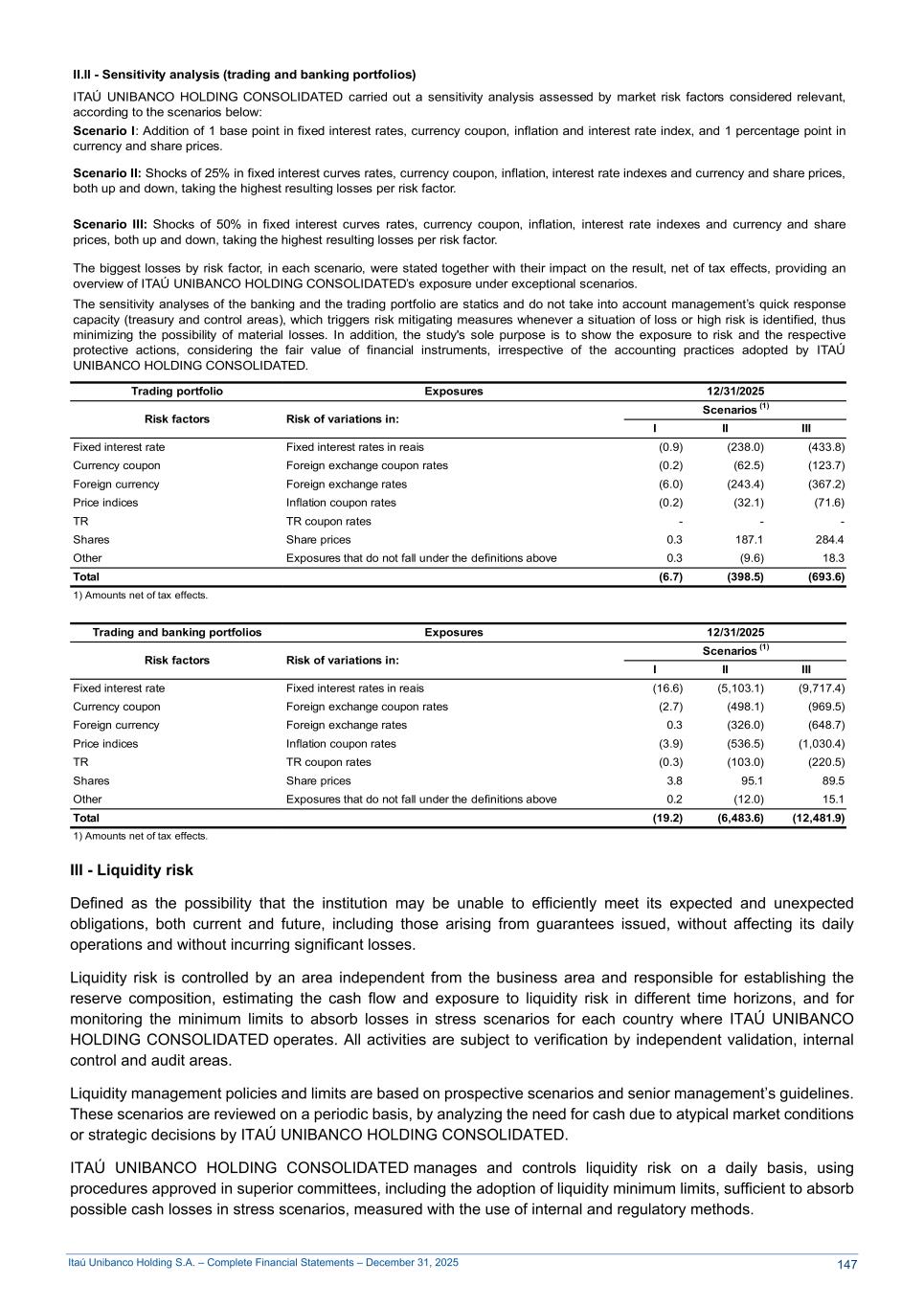 Itaú Unibanco Holding S.A. – Complete Financial Statements – December 31, 2025 II.ll - Sensitivity analysis (trading and banking portfolios) ITAÚ UNIBANCO HOLDING CONSOLIDATED carried out a sensitivity analysis assessed by market risk factors considered relevant, according to the scenarios below: Scenario I: Addition of 1 base point in fixed interest rates, currency coupon, inflation and interest rate index, and 1 percentage point in currency and share prices. Scenario II: Shocks of 25% in fixed interest curves rates, currency coupon, inflation, interest rate indexes and currency and share prices, both up and down, taking the highest resulting losses per risk factor. Scenario III: Shocks of 50% in fixed interest curves rates, currency coupon, inflation, interest rate indexes and currency and share prices, both up and down, taking the highest resulting losses per risk factor. The biggest losses by risk factor, in each scenario, were stated together with their impact on the result, net of tax effects, providing an overview of ITAÚ UNIBANCO HOLDING CONSOLIDATED’s exposure under exceptional scenarios. The sensitivity analyses of the banking and the trading portfolio are statics and do not take into account management’s quick response capacity (treasury and control areas), which triggers risk mitigating measures whenever a situation of loss or high risk is identified, thus minimizing the possibility of material losses. In addition, the study's sole purpose is to show the exposure to risk and the respective protective actions, considering the fair value of financial instruments, irrespective of the accounting practices adopted by ITAÚ UNIBANCO HOLDING CONSOLIDATED. Trading portfolio Exposures 12/31/2025 Risk factors Risk of variations in: Scenarios (1) I II III Fixed interest rate Fixed interest rates in reais (0.9) (238.0) (433.8) Currency coupon Foreign exchange coupon rates (0.2) (62.5) (123.7) Foreign currency Foreign exchange rates (6.0) (243.4) (367.2) Price indices Inflation coupon rates (0.2) (32.1) (71.6) TR TR coupon rates - - - Shares Share prices 0.3 187.1 284.4 Other Exposures that do not fall under the definitions above 0.3 (9.6) 18.3 Total (6.7) (398.5) (693.6) 1) Amounts net of tax effects. Trading and banking portfolios Exposures 12/31/2025 Risk factors Risk of variations in: Scenarios (1) I II III Fixed interest rate Fixed interest rates in reais (16.6) (5,103.1) (9,717.4) Currency coupon Foreign exchange coupon rates (2.7) (498.1) (969.5) Foreign currency Foreign exchange rates 0.3 (326.0) (648.7) Price indices Inflation coupon rates (3.9) (536.5) (1,030.4) TR TR coupon rates (0.3) (103.0) (220.5) Shares Share prices 3.8 95.1 89.5 Other Exposures that do not fall under the definitions above 0.2 (12.0) 15.1 Total (19.2) (6,483.6) (12,481.9) 1) Amounts net of tax effects. III - Liquidity risk Defined as the possibility that the institution may be unable to efficiently meet its expected and unexpected obligations, both current and future, including those arising from guarantees issued, without affecting its daily operations and without incurring significant losses. Liquidity risk is controlled by an area independent from the business area and responsible for establishing the reserve composition, estimating the cash flow and exposure to liquidity risk in different time horizons, and for monitoring the minimum limits to absorb losses in stress scenarios for each country where ITAÚ UNIBANCO HOLDING CONSOLIDATED operates. All activities are subject to verification by independent validation, internal control and audit areas. Liquidity management policies and limits are based on prospective scenarios and senior management’s guidelines. These scenarios are reviewed on a periodic basis, by analyzing the need for cash due to atypical market conditions or strategic decisions by ITAÚ UNIBANCO HOLDING CONSOLIDATED. ITAÚ UNIBANCO HOLDING CONSOLIDATED manages and controls liquidity risk on a daily basis, using procedures approved in superior committees, including the adoption of liquidity minimum limits, sufficient to absorb possible cash losses in stress scenarios, measured with the use of internal and regulatory methods. 147