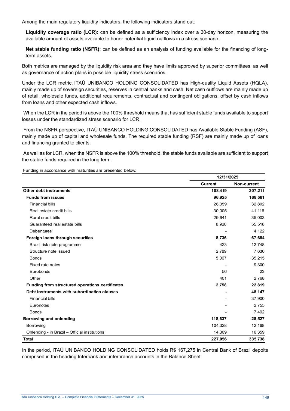 Itaú Unibanco Holding S.A. – Complete Financial Statements – December 31, 2025 Among the main regulatory liquidity indicators, the following indicators stand out: Liquidity coverage ratio (LCR): can be defined as a sufficiency index over a 30-day horizon, measuring the available amount of assets available to honor potential liquid outflows in a stress scenario. Net stable funding ratio (NSFR): can be defined as an analysis of funding available for the financing of long- term assets. Both metrics are managed by the liquidity risk area and they have limits approved by superior committees, as well as governance of action plans in possible liquidity stress scenarios. Under the LCR metric, ITAÚ UNIBANCO HOLDING CONSOLIDATED has High-quality Liquid Assets (HQLA), mainly made up of sovereign securities, reserves in central banks and cash. Net cash outflows are mainly made up of retail, wholesale funds, additional requirements, contractual and contingent obligations, offset by cash inflows from loans and other expected cash inflows. When the LCR in the period is above the 100% threshold means that has sufficient stable funds available to support losses under the standardized stress scenario for LCR. From the NSFR perspective, ITAÚ UNIBANCO HOLDING CONSOLIDATED has Available Stable Funding (ASF), mainly made up of capital and wholesale funds. The required stable funding (RSF) are mainly made up of loans and financing granted to clients. As well as for LCR, when the NSFR is above the 100% threshold, the stable funds available are sufficient to support the stable funds required in the long term. Funding in accordance with maturities are presented below: 12/31/2025 Current Non-current Other debt instruments 108,419 307,211 Funds from issues 96,925 168,561 Financial bills 28,359 32,802 Real estate credit bills 30,005 41,116 Rural credit bills 29,641 35,003 Guaranteed real estate bills 8,920 55,518 Debentures - 4,122 Foreign loans through securities 8,736 67,684 Brazil risk note programme 423 12,748 Structure note issued 2,789 7,630 Bonds 5,067 35,215 Fixed rate notes - 9,300 Eurobonds 56 23 Other 401 2,768 Funding from structured operations certificates 2,758 22,819 Debt instruments with subordination clauses - 48,147 Financial bills - 37,900 Euronotes - 2,755 Bonds - 7,492 Borrowing and onlending 118,637 28,527 Borrowing 104,328 12,168 Onlending - in Brazil – Official institutions 14,309 16,359 Total 227,056 335,738 In the period, ITAÚ UNIBANCO HOLDING CONSOLIDATED holds R$ 167,275 in Central Bank of Brazil depoits comprised in the heading Interbank and interbranch accounts in the Balance Sheet. 148