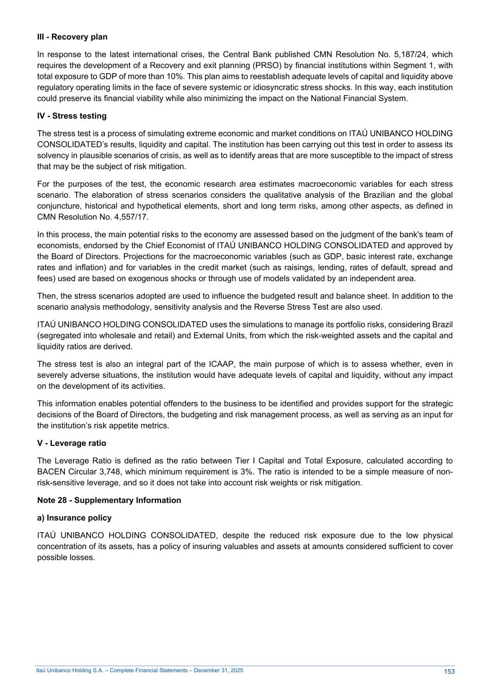 Itaú Unibanco Holding S.A. – Complete Financial Statements – December 31, 2025 III - Recovery plan In response to the latest international crises, the Central Bank published CMN Resolution No. 5,187/24, which requires the development of a Recovery and exit planning (PRSO) by financial institutions within Segment 1, with total exposure to GDP of more than 10%. This plan aims to reestablish adequate levels of capital and liquidity above regulatory operating limits in the face of severe systemic or idiosyncratic stress shocks. In this way, each institution could preserve its financial viability while also minimizing the impact on the National Financial System. IV - Stress testing The stress test is a process of simulating extreme economic and market conditions on ITAÚ UNIBANCO HOLDING CONSOLIDATED’s results, liquidity and capital. The institution has been carrying out this test in order to assess its solvency in plausible scenarios of crisis, as well as to identify areas that are more susceptible to the impact of stress that may be the subject of risk mitigation. For the purposes of the test, the economic research area estimates macroeconomic variables for each stress scenario. The elaboration of stress scenarios considers the qualitative analysis of the Brazilian and the global conjuncture, historical and hypothetical elements, short and long term risks, among other aspects, as defined in CMN Resolution No. 4,557/17. In this process, the main potential risks to the economy are assessed based on the judgment of the bank's team of economists, endorsed by the Chief Economist of ITAÚ UNIBANCO HOLDING CONSOLIDATED and approved by the Board of Directors. Projections for the macroeconomic variables (such as GDP, basic interest rate, exchange rates and inflation) and for variables in the credit market (such as raisings, lending, rates of default, spread and fees) used are based on exogenous shocks or through use of models validated by an independent area. Then, the stress scenarios adopted are used to influence the budgeted result and balance sheet. In addition to the scenario analysis methodology, sensitivity analysis and the Reverse Stress Test are also used. ITAÚ UNIBANCO HOLDING CONSOLIDATED uses the simulations to manage its portfolio risks, considering Brazil (segregated into wholesale and retail) and External Units, from which the risk-weighted assets and the capital and liquidity ratios are derived. The stress test is also an integral part of the ICAAP, the main purpose of which is to assess whether, even in severely adverse situations, the institution would have adequate levels of capital and liquidity, without any impact on the development of its activities. This information enables potential offenders to the business to be identified and provides support for the strategic decisions of the Board of Directors, the budgeting and risk management process, as well as serving as an input for the institution’s risk appetite metrics. V - Leverage ratio The Leverage Ratio is defined as the ratio between Tier I Capital and Total Exposure, calculated according to BACEN Circular 3,748, which minimum requirement is 3%. The ratio is intended to be a simple measure of non- risk-sensitive leverage, and so it does not take into account risk weights or risk mitigation. Note 28 - Supplementary Information a) Insurance policy ITAÚ UNIBANCO HOLDING CONSOLIDATED, despite the reduced risk exposure due to the low physical concentration of its assets, has a policy of insuring valuables and assets at amounts considered sufficient to cover possible losses. 153