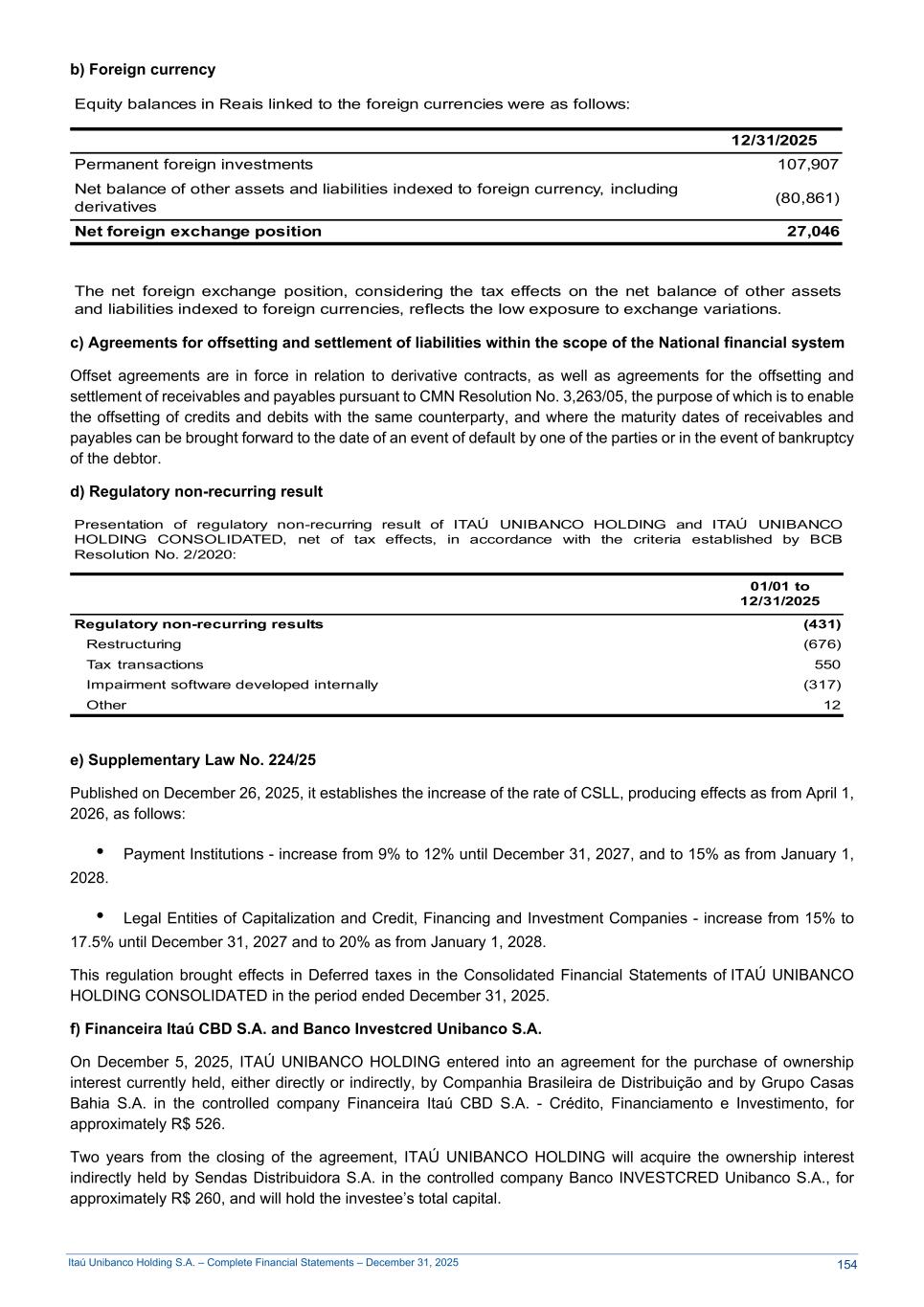 Itaú Unibanco Holding S.A. – Complete Financial Statements – December 31, 2025 b) Foreign currency Equity balances in Reais linked to the foreign currencies were as follows: 12/31/2025 Permanent foreign investments 107,907 Net balance of other assets and liabilities indexed to foreign currency, including derivatives (80,861) Net foreign exchange position 27,046 The net foreign exchange position, considering the tax effects on the net balance of other assets and liabilities indexed to foreign currencies, reflects the low exposure to exchange variations. c) Agreements for offsetting and settlement of liabilities within the scope of the National financial system Offset agreements are in force in relation to derivative contracts, as well as agreements for the offsetting and settlement of receivables and payables pursuant to CMN Resolution No. 3,263/05, the purpose of which is to enable the offsetting of credits and debits with the same counterparty, and where the maturity dates of receivables and payables can be brought forward to the date of an event of default by one of the parties or in the event of bankruptcy of the debtor. d) Regulatory non-recurring result Presentation of regulatory non-recurring result of ITAÚ UNIBANCO HOLDING and ITAÚ UNIBANCO HOLDING CONSOLIDATED, net of tax effects, in accordance with the criteria established by BCB Resolution No. 2/2020: 01/01 to 12/31/2025 Regulatory non-recurring results (431) Restructuring (676) Tax transactions 550 Impairment software developed internally (317) Other 12 e) Supplementary Law No. 224/25 Published on December 26, 2025, it establishes the increase of the rate of CSLL, producing effects as from April 1, 2026, as follows: • Payment Institutions - increase from 9% to 12% until December 31, 2027, and to 15% as from January 1, 2028. • Legal Entities of Capitalization and Credit, Financing and Investment Companies - increase from 15% to 17.5% until December 31, 2027 and to 20% as from January 1, 2028. This regulation brought effects in Deferred taxes in the Consolidated Financial Statements of ITAÚ UNIBANCO HOLDING CONSOLIDATED in the period ended December 31, 2025. f) Financeira Itaú CBD S.A. and Banco Investcred Unibanco S.A. On December 5, 2025, ITAÚ UNIBANCO HOLDING entered into an agreement for the purchase of ownership interest currently held, either directly or indirectly, by Companhia Brasileira de Distribuição and by Grupo Casas Bahia S.A. in the controlled company Financeira Itaú CBD S.A. - Crédito, Financiamento e Investimento, for approximately R$ 526. Two years from the closing of the agreement, ITAÚ UNIBANCO HOLDING will acquire the ownership interest indirectly held by Sendas Distribuidora S.A. in the controlled company Banco INVESTCRED Unibanco S.A., for approximately R$ 260, and will hold the investee’s total capital. 154