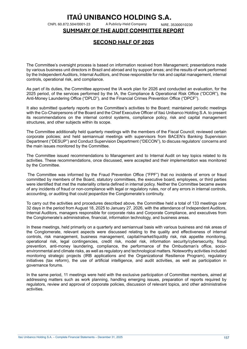 Itaú Unibanco Holding S.A. – Complete Financial Statements – December 31, 2025 ITAÚ UNIBANCO HOLDING S.A. NIRE. 35300010230 A Publicly-Held Company CNPJ. 60.872.504/0001-23 SUMMARY OF THE AUDIT COMMITTEE REPORT SECOND HALF OF 2025 The Committee’s oversight process is based on information received from Management; presentations made by various business unit directors in Brazil and abroad and by support areas; and the results of work performed by the Independent Auditors, Internal Auditors, and those responsible for risk and capital management, internal controls, operational risk, and compliance. As part of its duties, the Committee approved the IA work plan for 2026 and conducted an evaluation, for the 2025 period, of the services performed by the IA, the Compliance & Operational Risk Office (“DCOR”), the Anti-Money Laundering Office (“DPLD”), and the Financial Crimes Prevention Office (“DPCF”). It also submitted quarterly reports on the Committee’s activities to the Board; maintained periodic meetings with the Co-Chairpersons of the Board and the Chief Executive Officer of Itaú Unibanco Holding S.A. to present its recommendations on the internal control systems, compliance policy, risk and capital management structures, and other subjects within its scope. The Committee additionally held quarterly meetings with the members of the Fiscal Council; reviewed certain corporate policies; and held semiannual meetings with supervisors from BACEN’s Banking Supervision Department (“DESUP”) and Conduct Supervision Department (“DECON”), to discuss regulators’ concerns and the main issues monitored by the Committee. The Committee issued recommendations to Management and to Internal Audit on key topics related to its activities. These recommendations, once discussed, were accepted and their implementation was monitored by the Committee. The Committee was informed by the Fraud Prevention Office (“FPF”) that no incidents of errors or fraud committed by members of the Board, statutory committees, the executive board, employees, or third parties were identified that met the materiality criteria defined in internal policy. Neither the Committee became aware of any incidents of fraud or non-compliance with legal or regulatory rules, nor of any errors in internal controls, accounting, or auditing that could jeopardize the Conglomerate’s continuity. To carry out the activities and procedures described above, the Committee held a total of 133 meetings over 32 days in the period from August 18, 2025 to January 27, 2026, with the attendance of Independent Auditors, Internal Auditors, managers responsible for corporate risks and Corporate Compliance, and executives from the Conglomerate’s administrative, financial, information technology, and business areas. In these meetings, held primarily on a quarterly and semiannual basis with various business and risk areas of the Conglomerate, relevant aspects were discussed relating to the quality and effectiveness of internal controls, risk management, business management, capital/market/liquidity risk, risk appetite monitoring, operational risk, legal contingencies, credit risk, model risk, information security/cybersecurity, fraud prevention, anti-money laundering, compliance, the performance of the Ombudsman’s office, socio- environmental and climate risks, as well as regulatory and technological matters. Noteworthy activities included monitoring strategic projects (IRB applications and the Organizational Resilience Program), regulatory initiatives (tax reform), the use of artificial intelligence, and audit activities, as well as participation in governance forums. In the same period, 11 meetings were held with the exclusive participation of Committee members, aimed at addressing matters such as work planning, handling emerging issues, preparation of reports required by regulators, review and approval of corporate policies, discussion of relevant topics, and other administrative activities. 157