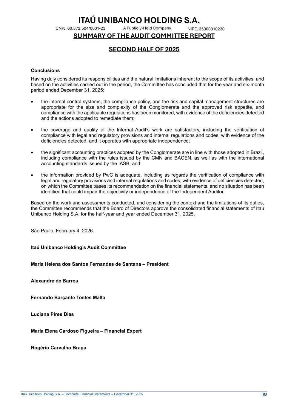 Itaú Unibanco Holding S.A. – Complete Financial Statements – December 31, 2025 ITAÚ UNIBANCO HOLDING S.A. NIRE. 35300010230 A Publicly-Held Company CNPJ. 60.872.504/0001-23 SUMMARY OF THE AUDIT COMMITTEE REPORT SECOND HALF OF 2025 Conclusions Having duly considered its responsibilities and the natural limitations inherent to the scope of its activities, and based on the activities carried out in the period, the Committee has concluded that for the year and six-month period ended December 31, 2025: • the internal control systems, the compliance policy, and the risk and capital management structures are appropriate for the size and complexity of the Conglomerate and the approved risk appetite, and compliance with the applicable regulations has been monitored, with evidence of the deficiencies detected and the actions adopted to remediate them; • the coverage and quality of the Internal Audit’s work are satisfactory, including the verification of compliance with legal and regulatory provisions and internal regulations and codes, with evidence of the deficiencies detected, and it operates with appropriate independence; • the significant accounting practices adopted by the Conglomerate are in line with those adopted in Brazil, including compliance with the rules issued by the CMN and BACEN, as well as with the international accounting standards issued by the IASB; and • the information provided by PwC is adequate, including as regards the verification of compliance with legal and regulatory provisions and internal regulations and codes, with evidence of deficiencies detected, on which the Committee bases its recommendation on the financial statements, and no situation has been identified that could impair the objectivity or independence of the Independent Auditor. Based on the work and assessments conducted, and considering the context and the limitations of its duties, the Committee recommends that the Board of Directors approve the consolidated financial statements of Itaú Unibanco Holding S.A. for the half-year and year ended December 31, 2025. São Paulo, February 4, 2026. Itaú Unibanco Holding’s Audit Committee Maria Helena dos Santos Fernandes de Santana – President Alexandre de Barros Fernando Barçante Tostes Malta Luciana Pires Dias Maria Elena Cardoso Figueira – Financial Expert Rogério Carvalho Braga 158