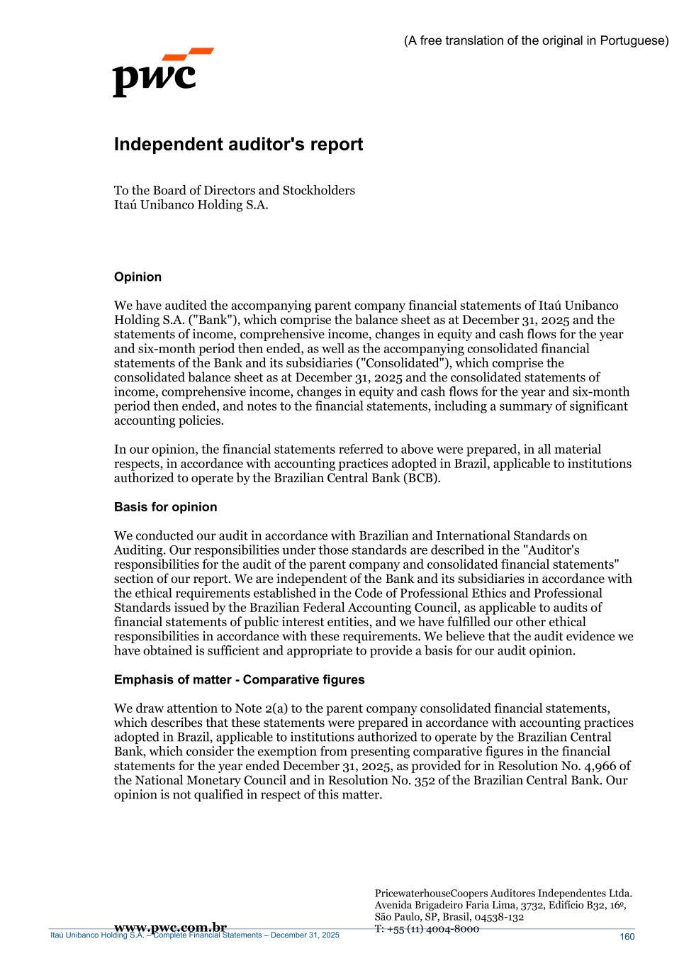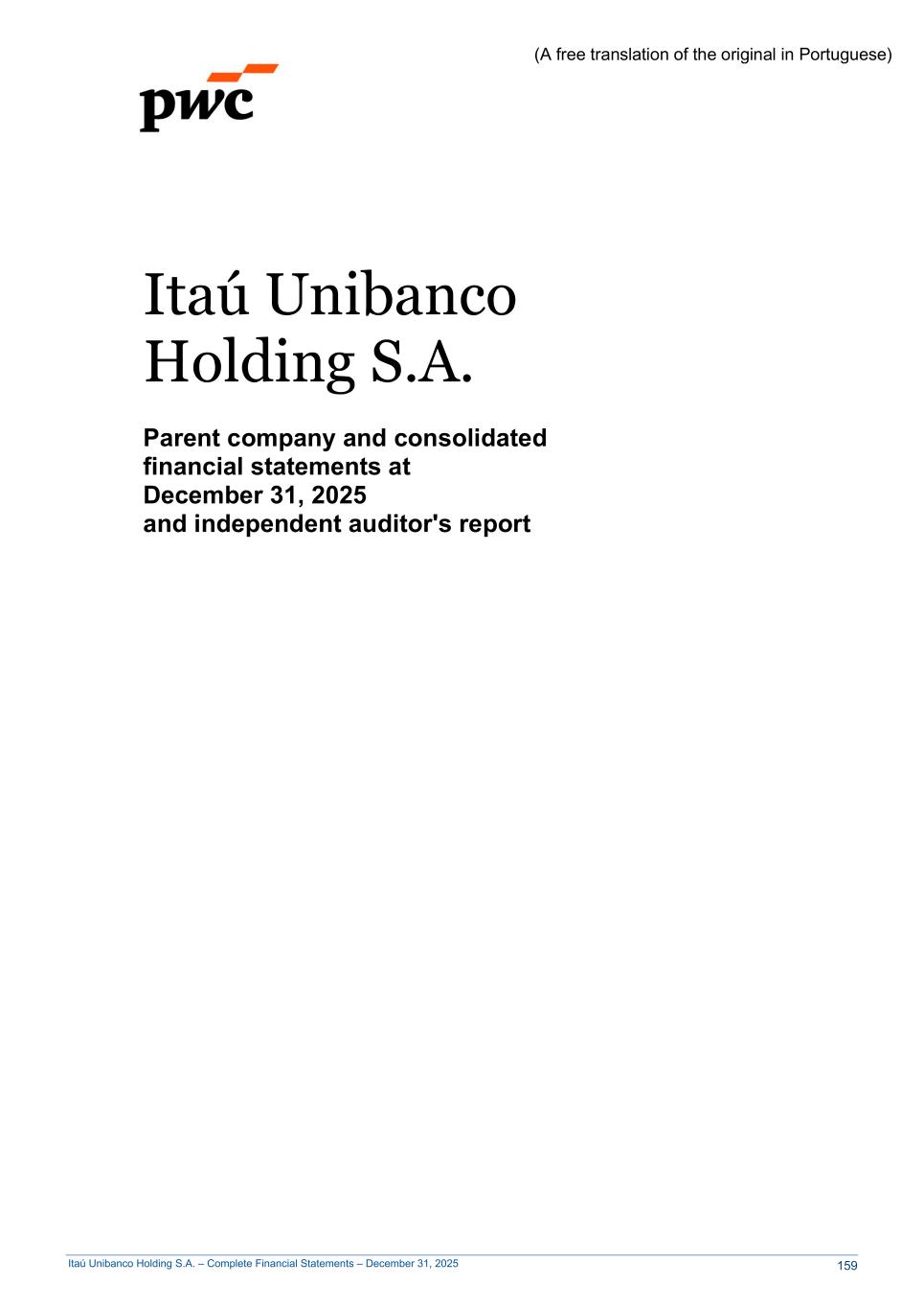 Itaú Unibanco Holding S.A. – Complete Financial Statements – December 31, 2025 www.pwc.com.br PricewaterhouseCoopers Auditores Independentes Ltda. Avenida Brigadeiro Faria Lima, 3732, Edifício B32, 16o, São Paulo, SP, Brasil, 04538-132 T: +55 (11) 4004-8000 (A free translation of the original in Portuguese) Independent auditor's report To the Board of Directors and Stockholders Itaú Unibanco Holding S.A. Opinion We have audited the accompanying parent company financial statements of Itaú Unibanco Holding S.A. ("Bank"), which comprise the balance sheet as at December 31, 2025 and the statements of income, comprehensive income, changes in equity and cash flows for the year and six-month period then ended, as well as the accompanying consolidated financial statements of the Bank and its subsidiaries ("Consolidated"), which comprise the consolidated balance sheet as at December 31, 2025 and the consolidated statements of income, comprehensive income, changes in equity and cash flows for the year and six-month period then ended, and notes to the financial statements, including a summary of significant accounting policies. In our opinion, the financial statements referred to above were prepared, in all material respects, in accordance with accounting practices adopted in Brazil, applicable to institutions authorized to operate by the Brazilian Central Bank (BCB). Basis for opinion We conducted our audit in accordance with Brazilian and International Standards on Auditing. Our responsibilities under those standards are described in the "Auditor's responsibilities for the audit of the parent company and consolidated financial statements" section of our report. We are independent of the Bank and its subsidiaries in accordance with the ethical requirements established in the Code of Professional Ethics and Professional Standards issued by the Brazilian Federal Accounting Council, as applicable to audits of financial statements of public interest entities, and we have fulfilled our other ethical responsibilities in accordance with these requirements. We believe that the audit evidence we have obtained is sufficient and appropriate to provide a basis for our audit opinion. Emphasis of matter - Comparative figures We draw attention to Note 2(a) to the parent company consolidated financial statements, which describes that these statements were prepared in accordance with accounting practices adopted in Brazil, applicable to institutions authorized to operate by the Brazilian Central Bank, which consider the exemption from presenting comparative figures in the financial statements for the year ended December 31, 2025, as provided for in Resolution No. 4,966 of the National Monetary Council and in Resolution No. 352 of the Brazilian Central Bank. Our opinion is not qualified in respect of this matter. 160