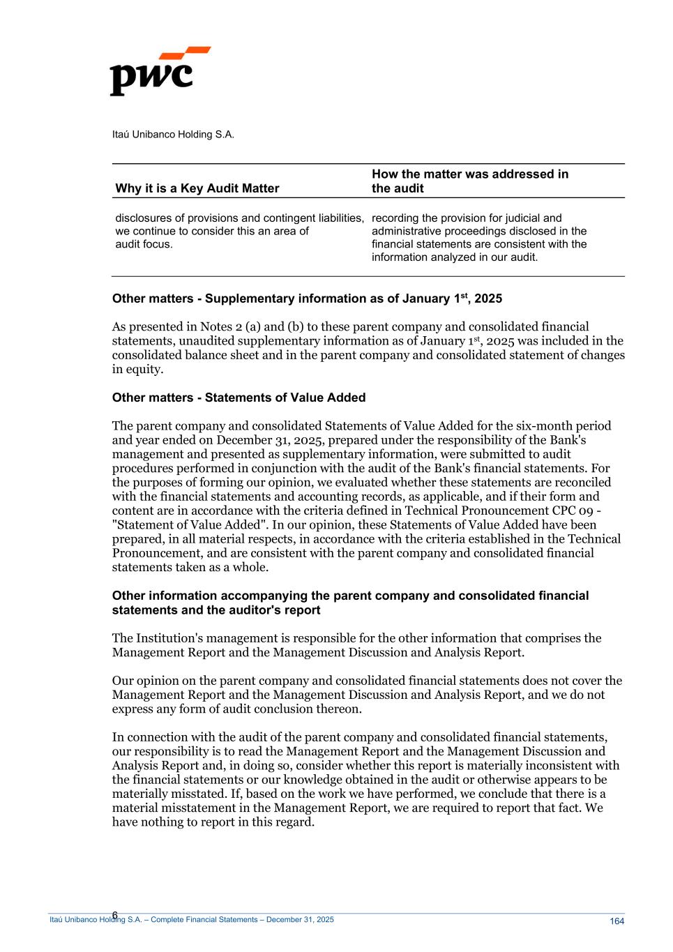 Itaú Unibanco Holding S.A. – Complete Financial Statements – December 31, 2025 Itaú Unibanco Holding S.A. 6 Why it is a Key Audit Matter How the matter was addressed in the audit disclosures of provisions and contingent liabilities, we continue to consider this an area of audit focus. recording the provision for judicial and administrative proceedings disclosed in the financial statements are consistent with the information analyzed in our audit. Other matters - Supplementary information as of January 1st, 2025 As presented in Notes 2 (a) and (b) to these parent company and consolidated financial statements, unaudited supplementary information as of January 1st, 2025 was included in the consolidated balance sheet and in the parent company and consolidated statement of changes in equity. Other matters - Statements of Value Added The parent company and consolidated Statements of Value Added for the six-month period and year ended on December 31, 2025, prepared under the responsibility of the Bank's management and presented as supplementary information, were submitted to audit procedures performed in conjunction with the audit of the Bank's financial statements. For the purposes of forming our opinion, we evaluated whether these statements are reconciled with the financial statements and accounting records, as applicable, and if their form and content are in accordance with the criteria defined in Technical Pronouncement CPC 09 - "Statement of Value Added". In our opinion, these Statements of Value Added have been prepared, in all material respects, in accordance with the criteria established in the Technical Pronouncement, and are consistent with the parent company and consolidated financial statements taken as a whole. Other information accompanying the parent company and consolidated financial statements and the auditor's report The Institution's management is responsible for the other information that comprises the Management Report and the Management Discussion and Analysis Report. Our opinion on the parent company and consolidated financial statements does not cover the Management Report and the Management Discussion and Analysis Report, and we do not express any form of audit conclusion thereon. In connection with the audit of the parent company and consolidated financial statements, our responsibility is to read the Management Report and the Management Discussion and Analysis Report and, in doing so, consider whether this report is materially inconsistent with the financial statements or our knowledge obtained in the audit or otherwise appears to be materially misstated. If, based on the work we have performed, we conclude that there is a material misstatement in the Management Report, we are required to report that fact. We have nothing to report in this regard. 164