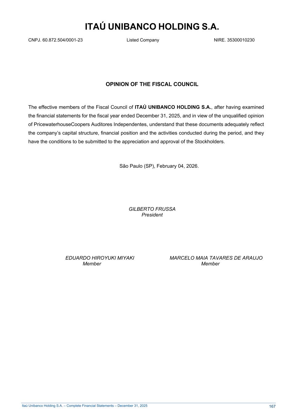 Itaú Unibanco Holding S.A. – Complete Financial Statements – December 31, 2025 ITAÚ UNIBANCO HOLDING S.A. CNPJ. 60.872.504/0001-23 Listed Company NIRE. 35300010230 OPINION OF THE FISCAL COUNCIL The effective members of the Fiscal Council of ITAÚ UNIBANCO HOLDING S.A., after having examined the financial statements for the fiscal year ended December 31, 2025, and in view of the unqualified opinion of PricewaterhouseCoopers Auditores Independentes, understand that these documents adequately reflect the company’s capital structure, financial position and the activities conducted during the period, and they have the conditions to be submitted to the appreciation and approval of the Stockholders. São Paulo (SP), February 04, 2026. GILBERTO FRUSSA President EDUARDO HIROYUKI MIYAKI MARCELO MAIA TAVARES DE ARAUJO Member Member 167
