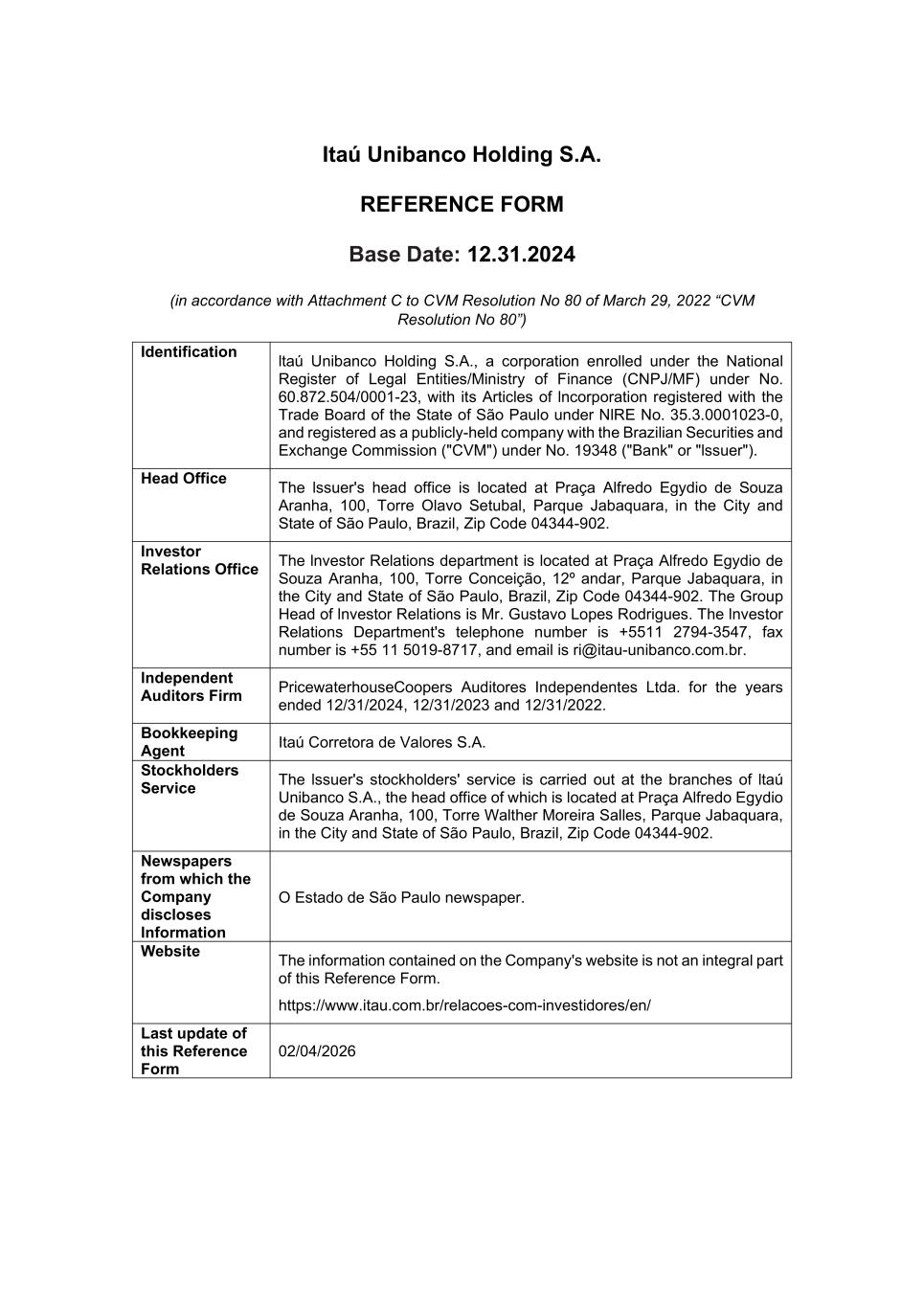 Itaú Unibanco Holding S.A. REFERENCE FORM Base Date: 12.31.2024 (in accordance with Attachment C to CVM Resolution No 80 of March 29, 2022 “CVM Resolution No 80”) Identification ltaú Unibanco Holding S.A., a corporation enrolled under the National Register of Legal Entities/Ministry of Finance (CNPJ/MF) under No. 60.872.504/0001-23, with its Articles of lncorporation registered with the Trade Board of the State of São Paulo under NlRE No. 35.3.0001023-0, and registered as a publicly-held company with the Brazilian Securities and Exchange Commission ("CVM") under No. 19348 ("Bank" or "lssuer"). Head Office The lssuer's head office is located at Praça Alfredo Egydio de Souza Aranha, 100, Torre Olavo Setubal, Parque Jabaquara, in the City and State of São Paulo, Brazil, Zip Code 04344-902. Investor Relations Office The lnvestor Relations department is located at Praça Alfredo Egydio de Souza Aranha, 100, Torre Conceição, 12º andar, Parque Jabaquara, in the City and State of São Paulo, Brazil, Zip Code 04344-902. The Group Head of lnvestor Relations is Mr. Gustavo Lopes Rodrigues. The lnvestor Relations Department's telephone number is +5511 2794-3547, fax number is +55 11 5019-8717, and email is ri@itau-unibanco.com.br. lndependent Auditors Firm PricewaterhouseCoopers Auditores Independentes Ltda. for the years ended 12/31/2024, 12/31/2023 and 12/31/2022. Bookkeeping Agent Itaú Corretora de Valores S.A. Stockholders Service The lssuer's stockholders' service is carried out at the branches of ltaú Unibanco S.A., the head office of which is located at Praça Alfredo Egydio de Souza Aranha, 100, Torre Walther Moreira Salles, Parque Jabaquara, in the City and State of São Paulo, Brazil, Zip Code 04344-902. Newspapers from which the Company discloses lnformation O Estado de São Paulo newspaper. Website The information contained on the Company's website is not an integral part of this Reference Form. https://www.itau.com.br/relacoes-com-investidores/en/ Last update of this Reference Form 02/04/2026
