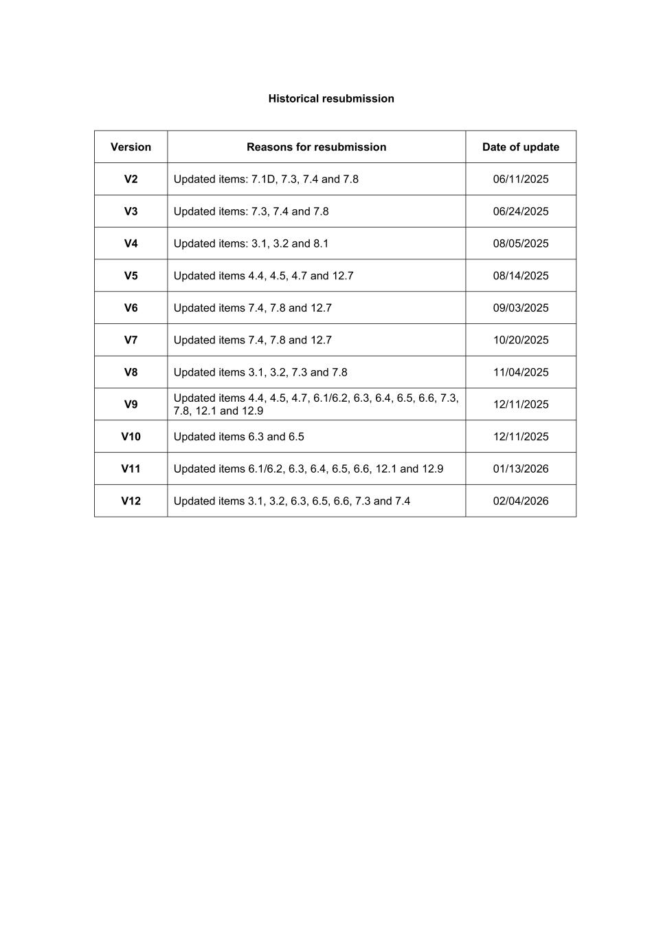 Historical resubmission Version Reasons for resubmission Date of update V2 Updated items: 7.1D, 7.3, 7.4 and 7.8 06/11/2025 V3 Updated items: 7.3, 7.4 and 7.8 06/24/2025 V4 Updated items: 3.1, 3.2 and 8.1 08/05/2025 V5 Updated items 4.4, 4.5, 4.7 and 12.7 08/14/2025 V6 Updated items 7.4, 7.8 and 12.7 09/03/2025 V7 Updated items 7.4, 7.8 and 12.7 10/20/2025 V8 Updated items 3.1, 3.2, 7.3 and 7.8 11/04/2025 V9 Updated items 4.4, 4.5, 4.7, 6.1/6.2, 6.3, 6.4, 6.5, 6.6, 7.3, 7.8, 12.1 and 12.9 12/11/2025 V10 Updated items 6.3 and 6.5 12/11/2025 V11 Updated items 6.1/6.2, 6.3, 6.4, 6.5, 6.6, 12.1 and 12.9 01/13/2026 V12 Updated items 3.1, 3.2, 6.3, 6.5, 6.6, 7.3 and 7.4 02/04/2026