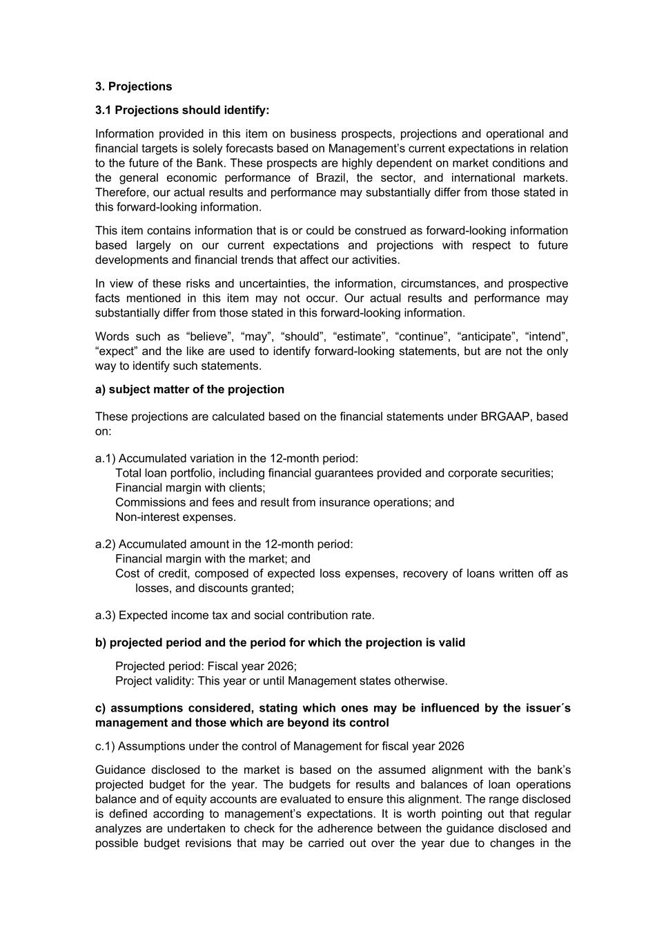 3. Projections 3.1 Projections should identify: Information provided in this item on business prospects, projections and operational and financial targets is solely forecasts based on Management’s current expectations in relation to the future of the Bank. These prospects are highly dependent on market conditions and the general economic performance of Brazil, the sector, and international markets. Therefore, our actual results and performance may substantially differ from those stated in this forward-looking information. This item contains information that is or could be construed as forward-looking information based largely on our current expectations and projections with respect to future developments and financial trends that affect our activities. In view of these risks and uncertainties, the information, circumstances, and prospective facts mentioned in this item may not occur. Our actual results and performance may substantially differ from those stated in this forward-looking information. Words such as “believe”, “may”, “should”, “estimate”, “continue”, “anticipate”, “intend”, “expect” and the like are used to identify forward-looking statements, but are not the only way to identify such statements. a) subject matter of the projection These projections are calculated based on the financial statements under BRGAAP, based on: a.1) Accumulated variation in the 12-month period: Total loan portfolio, including financial guarantees provided and corporate securities; Financial margin with clients; Commissions and fees and result from insurance operations; and Non-interest expenses. a.2) Accumulated amount in the 12-month period: Financial margin with the market; and Cost of credit, composed of expected loss expenses, recovery of loans written off as losses, and discounts granted; a.3) Expected income tax and social contribution rate. b) projected period and the period for which the projection is valid Projected period: Fiscal year 2026; Project validity: This year or until Management states otherwise. c) assumptions considered, stating which ones may be influenced by the issuer´s management and those which are beyond its control c.1) Assumptions under the control of Management for fiscal year 2026 Guidance disclosed to the market is based on the assumed alignment with the bank’s projected budget for the year. The budgets for results and balances of loan operations balance and of equity accounts are evaluated to ensure this alignment. The range disclosed is defined according to management’s expectations. It is worth pointing out that regular analyzes are undertaken to check for the adherence between the guidance disclosed and possible budget revisions that may be carried out over the year due to changes in the