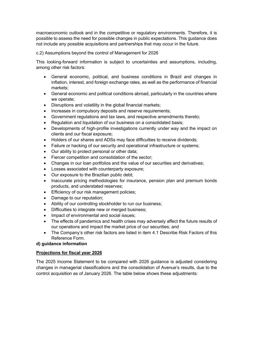 macroeconomic outlook and in the competitive or regulatory environments. Therefore, it is possible to assess the need for possible changes in public expectations. This guidance does not include any possible acquisitions and partnerships that may occur in the future. c.2) Assumptions beyond the control of Management for 2026 This looking-forward information is subject to uncertainties and assumptions, including, among other risk factors: • General economic, political, and business conditions in Brazil and changes in inflation, interest, and foreign exchange rates, as well as the performance of financial markets; • General economic and political conditions abroad, particularly in the countries where we operate; • Disruptions and volatility in the global financial markets; • Increases in compulsory deposits and reserve requirements; • Government regulations and tax laws, and respective amendments thereto; • Regulation and liquidation of our business on a consolidated basis; • Developments of high-profile investigations currently under way and the impact on clients and our fiscal exposure; • Holders of our shares and ADSs may face difficulties to receive dividends; • Failure or hacking of our security and operational infrastructure or systems; • Our ability to protect personal or other data; • Fiercer competition and consolidation of the sector; • Changes in our loan portfolios and the value of our securities and derivatives; • Losses associated with counterparty exposure; • Our exposure to the Brazilian public debt; • Inaccurate pricing methodologies for insurance, pension plan and premium bonds products, and understated reserves; • Efficiency of our risk management policies; • Damage to our reputation; • Ability of our controlling stockholder to run our business; • Difficulties to integrate new or merged business; • Impact of environmental and social issues; • The effects of pandemics and health crises may adversely affect the future results of our operations and impact the market price of our securities; and • The Company’s other risk factors are listed in item 4.1 Describe Risk Factors of this Reference Form. d) guidance information Projections for fiscal year 2026 The 2025 Income Statement to be compared with 2026 guidance is adjusted considering changes in managerial classifications and the consolidation of Avenue’s results, due to the control acquisition as of January 2026. The table below shows these adjustments: