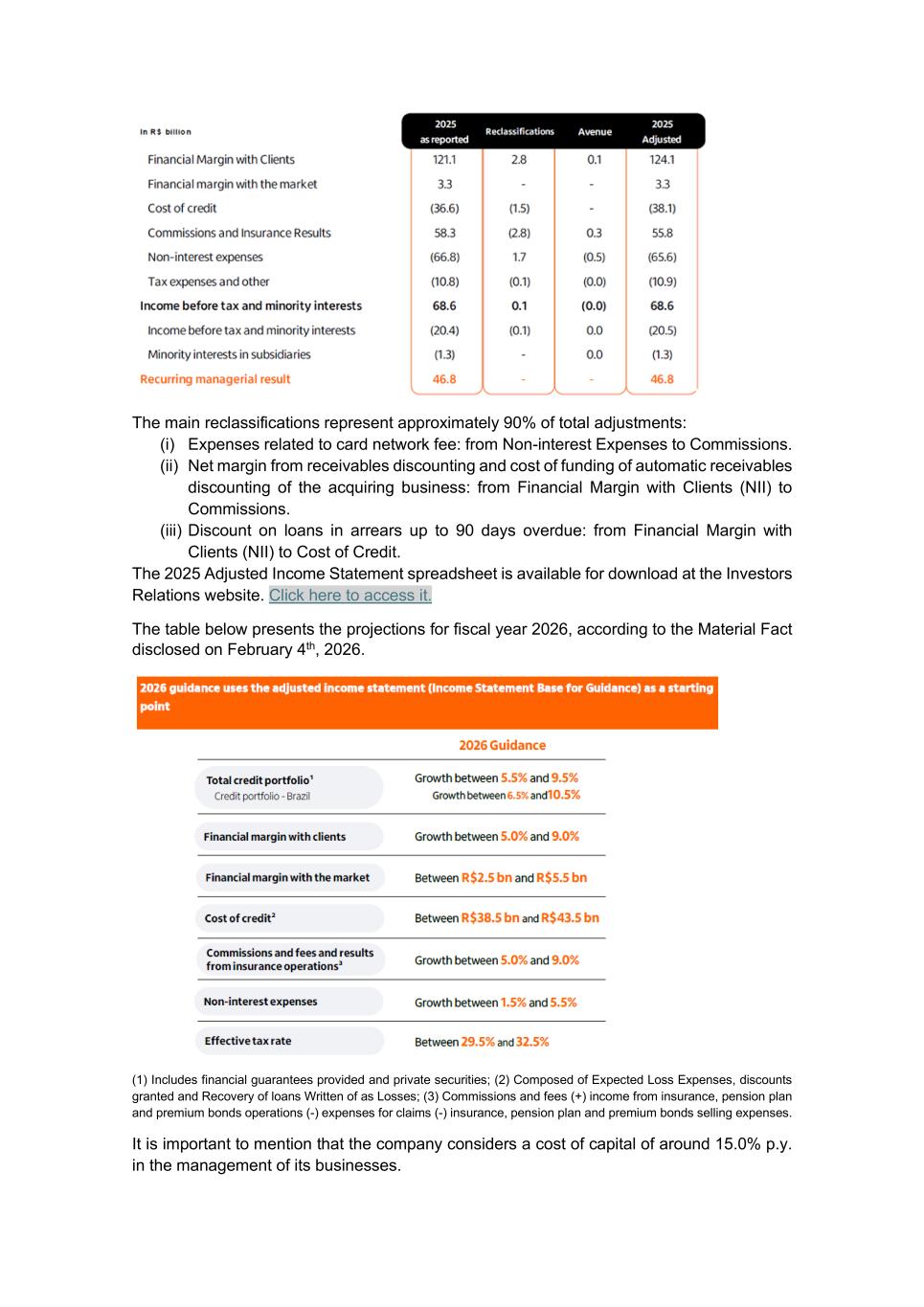 The main reclassifications represent approximately 90% of total adjustments: (i) Expenses related to card network fee: from Non-interest Expenses to Commissions. (ii) Net margin from receivables discounting and cost of funding of automatic receivables discounting of the acquiring business: from Financial Margin with Clients (NII) to Commissions. (iii) Discount on loans in arrears up to 90 days overdue: from Financial Margin with Clients (NII) to Cost of Credit. The 2025 Adjusted Income Statement spreadsheet is available for download at the Investors Relations website. Click here to access it. The table below presents the projections for fiscal year 2026, according to the Material Fact disclosed on February 4th, 2026. (1) Includes financial guarantees provided and private securities; (2) Composed of Expected Loss Expenses, discounts granted and Recovery of loans Written of as Losses; (3) Commissions and fees (+) income from insurance, pension plan and premium bonds operations (-) expenses for claims (-) insurance, pension plan and premium bonds selling expenses. It is important to mention that the company considers a cost of capital of around 15.0% p.y. in the management of its businesses.