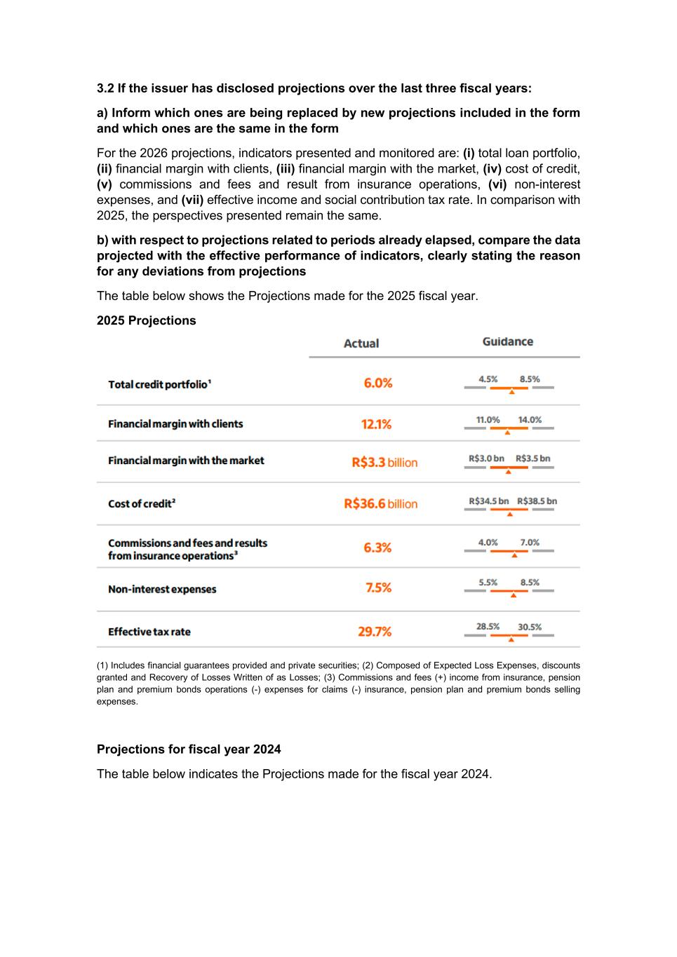 3.2 If the issuer has disclosed projections over the last three fiscal years: a) Inform which ones are being replaced by new projections included in the form and which ones are the same in the form For the 2026 projections, indicators presented and monitored are: (i) total loan portfolio, (ii) financial margin with clients, (iii) financial margin with the market, (iv) cost of credit, (v) commissions and fees and result from insurance operations, (vi) non-interest expenses, and (vii) effective income and social contribution tax rate. In comparison with 2025, the perspectives presented remain the same. b) with respect to projections related to periods already elapsed, compare the data projected with the effective performance of indicators, clearly stating the reason for any deviations from projections The table below shows the Projections made for the 2025 fiscal year. 2025 Projections (1) Includes financial guarantees provided and private securities; (2) Composed of Expected Loss Expenses, discounts granted and Recovery of Losses Written of as Losses; (3) Commissions and fees (+) income from insurance, pension plan and premium bonds operations (-) expenses for claims (-) insurance, pension plan and premium bonds selling expenses. Projections for fiscal year 2024 The table below indicates the Projections made for the fiscal year 2024.