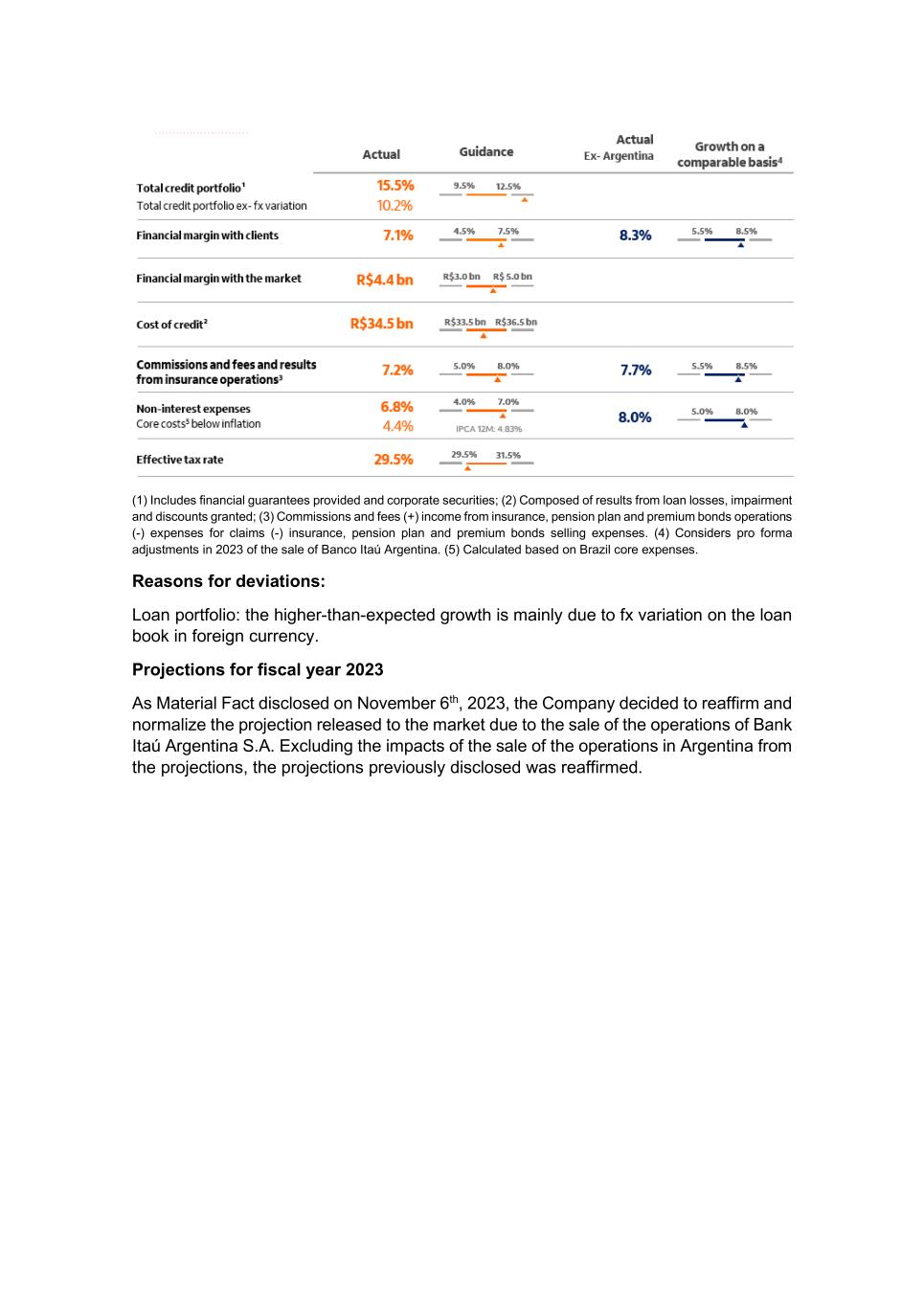 (1) Includes financial guarantees provided and corporate securities; (2) Composed of results from loan losses, impairment and discounts granted; (3) Commissions and fees (+) income from insurance, pension plan and premium bonds operations (-) expenses for claims (-) insurance, pension plan and premium bonds selling expenses. (4) Considers pro forma adjustments in 2023 of the sale of Banco Itaú Argentina. (5) Calculated based on Brazil core expenses. Reasons for deviations: Loan portfolio: the higher-than-expected growth is mainly due to fx variation on the loan book in foreign currency. Projections for fiscal year 2023 As Material Fact disclosed on November 6th, 2023, the Company decided to reaffirm and normalize the projection released to the market due to the sale of the operations of Bank Itaú Argentina S.A. Excluding the impacts of the sale of the operations in Argentina from the projections, the projections previously disclosed was reaffirmed.