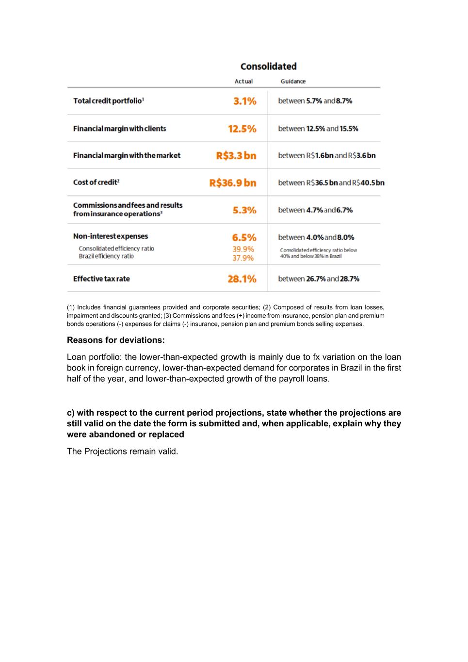 (1) Includes financial guarantees provided and corporate securities; (2) Composed of results from loan losses, impairment and discounts granted; (3) Commissions and fees (+) income from insurance, pension plan and premium bonds operations (-) expenses for claims (-) insurance, pension plan and premium bonds selling expenses. Reasons for deviations: Loan portfolio: the lower-than-expected growth is mainly due to fx variation on the loan book in foreign currency, lower-than-expected demand for corporates in Brazil in the first half of the year, and lower-than-expected growth of the payroll loans. c) with respect to the current period projections, state whether the projections are still valid on the date the form is submitted and, when applicable, explain why they were abandoned or replaced The Projections remain valid.