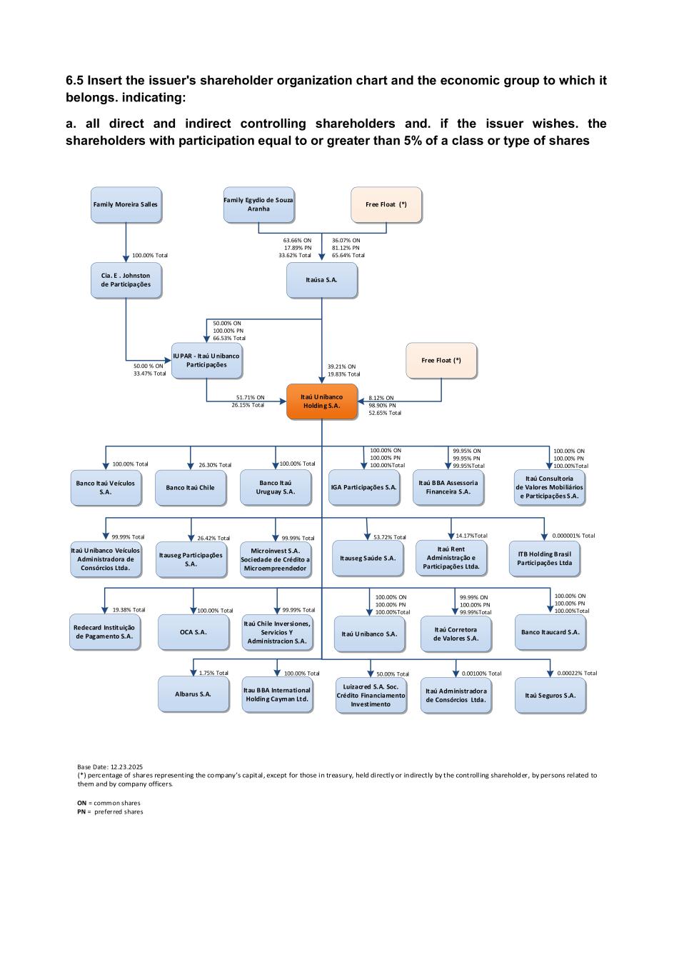 6.5 Insert the issuer's shareholder organization chart and the economic group to which it belongs. indicating: a. all direct and indirect controlling shareholders and. if the issuer wishes. the shareholders with participation equal to or greater than 5% of a class or type of shares Itaú U nibanco Holdin g S.A. IU PAR - Itaú U nibanco Participações Itaúsa S.A. 39.21% ON 19.83% Total 51.71% ON 26.15% Total 50.00% ON 100.00% PN 66.53% Total Free Float (*) Cia. E . Johnston de Participações 8.12% ON 98.90% PN 52.65% Total 50.00 % ON 33.47% Total Family Egydio de Souza Aranha Free Float (*)Family Moreira Salles 100.00% Total 63.66% ON 17.89% PN 33.62% Total 36.07% ON 81.12% PN 65.64% Total Banco Itaucard S.A.Itaú U nibanco S.A. Itaú Consultoria de Valores Mobiliários e Participações S.A. OCA S.A. Itaú Corretora de Valores S.A. Itaú BBA Assessoria Financeira S.A. Banco Itaú Uruguay S.A. 100.00% Total 100.00% Total 100.00% ON 100.00% PN 100.00%Total 99.99% ON 100.00% PN 99.99%Total 100.00% ON 100.00% PN 100.00%Total 99.95% ON 99.95% PN 99.95%Total 100.00% ON 100.00% PN 100.00%Total Itaú Chile Inversiones, Servicios Y Administracion S.A. 99.99% Total Banco Itaú Chile 26.30% Total IGA Participações S.A. 100.00% ON 100.00% PN 100.00%Total Itauseg Saúde S.A. Itaú Rent Administração e Participações Ltda. 14.17%Total ITB Holding Brasil Participações Ltda Banco Itaú Veículos S.A. Itaú U nibanco Veículos Administradora de Consórcios Ltda. Itauseg Participações S.A. Microinvest S.A. Sociedade de Crédito a Microempreendedor 100.00% Total 99.99% Total 26.42% Total 99.99% Total Redecard Instituição de Pagamento S.A. 19.38% Total Luizacred S.A. Soc. Crédito Financiamento Invest imento 50.00% Total 53.72% Total 0.000001% Total ON = common shares PN = preferred shares Base Date: 12.23.2025 Itaú Administradora de Consórcios Ltda. Itaú Seguros S.A. 0.00100% Total 0.00022% Total Albarus S.A. Itau BBA International Holdin g Cayman Ltd. 1.75% Total 100.00% Total