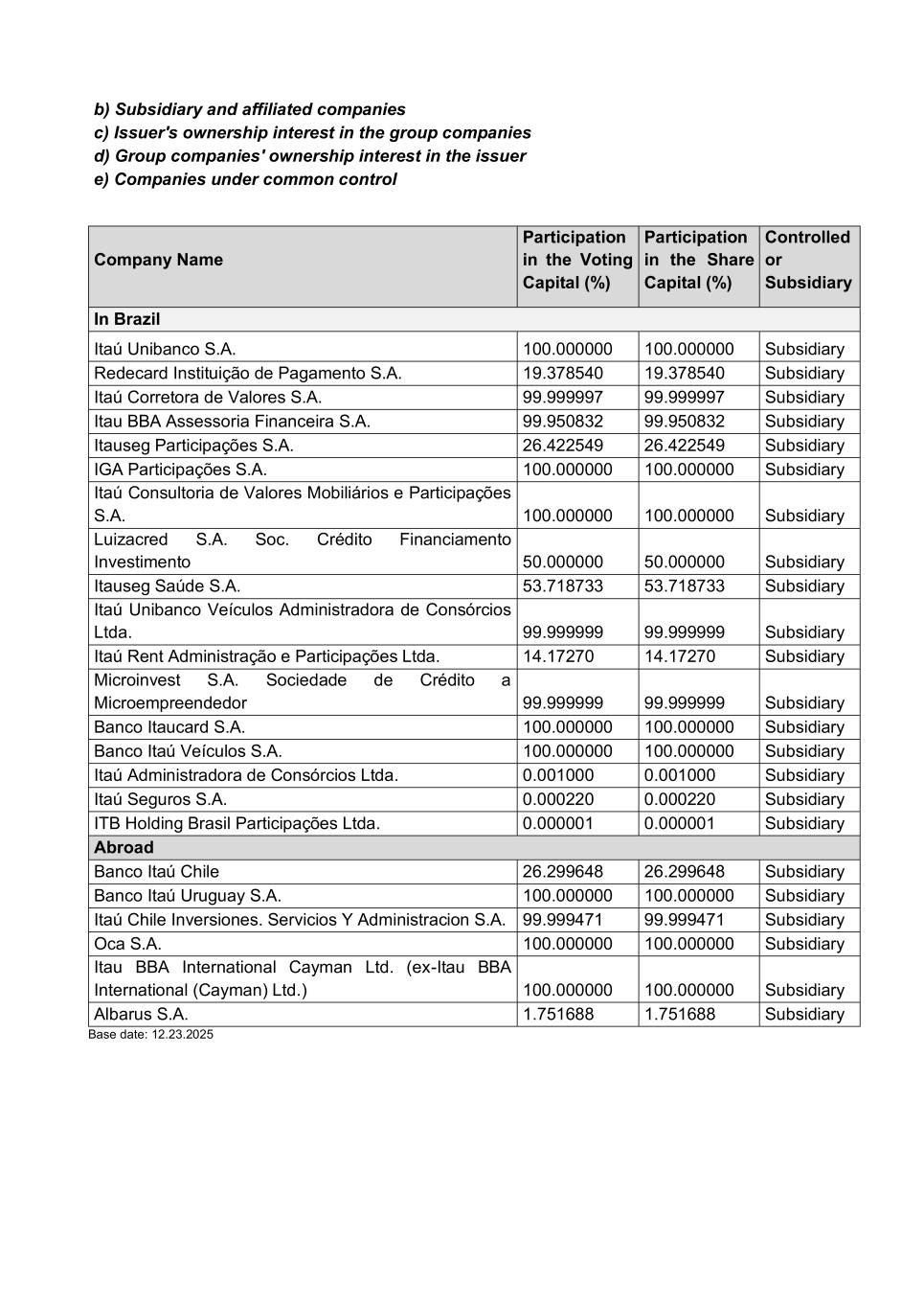b) Subsidiary and affiliated companies c) Issuer's ownership interest in the group companies d) Group companies' ownership interest in the issuer e) Companies under common control Company Name Participation in the Voting Capital (%) Participation in the Share Capital (%) Controlled or Subsidiary In Brazil Itaú Unibanco S.A. 100.000000 100.000000 Subsidiary Redecard Instituição de Pagamento S.A. 19.378540 19.378540 Subsidiary Itaú Corretora de Valores S.A. 99.999997 99.999997 Subsidiary Itau BBA Assessoria Financeira S.A. 99.950832 99.950832 Subsidiary Itauseg Participações S.A. 26.422549 26.422549 Subsidiary IGA Participações S.A. 100.000000 100.000000 Subsidiary Itaú Consultoria de Valores Mobiliários e Participações S.A. 100.000000 100.000000 Subsidiary Luizacred S.A. Soc. Crédito Financiamento Investimento 50.000000 50.000000 Subsidiary Itauseg Saúde S.A. 53.718733 53.718733 Subsidiary Itaú Unibanco Veículos Administradora de Consórcios Ltda. 99.999999 99.999999 Subsidiary Itaú Rent Administração e Participações Ltda. 14.17270 14.17270 Subsidiary Microinvest S.A. Sociedade de Crédito a Microempreendedor 99.999999 99.999999 Subsidiary Banco Itaucard S.A. 100.000000 100.000000 Subsidiary Banco Itaú Veículos S.A. 100.000000 100.000000 Subsidiary Itaú Administradora de Consórcios Ltda. 0.001000 0.001000 Subsidiary Itaú Seguros S.A. 0.000220 0.000220 Subsidiary ITB Holding Brasil Participações Ltda. 0.000001 0.000001 Subsidiary Abroad Banco Itaú Chile 26.299648 26.299648 Subsidiary Banco Itaú Uruguay S.A. 100.000000 100.000000 Subsidiary Itaú Chile Inversiones. Servicios Y Administracion S.A. 99.999471 99.999471 Subsidiary Oca S.A. 100.000000 100.000000 Subsidiary Itau BBA International Cayman Ltd. (ex-Itau BBA International (Cayman) Ltd.) 100.000000 100.000000 Subsidiary Albarus S.A. 1.751688 1.751688 Subsidiary Base date: 12.23.2025