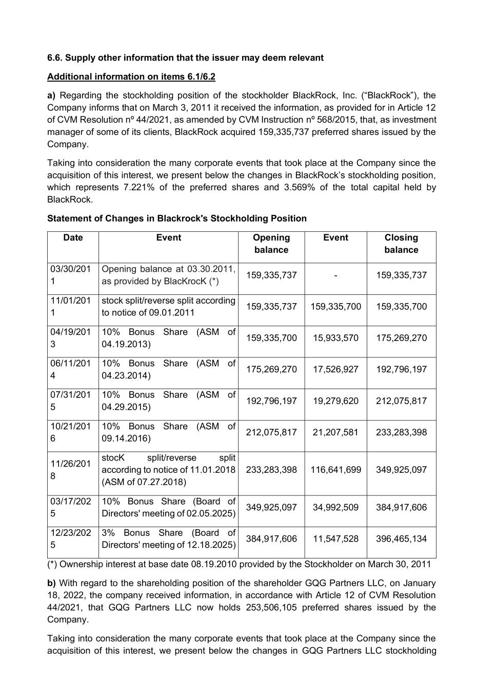 6.6. Supply other information that the issuer may deem relevant Additional information on items 6.1/6.2 a) Regarding the stockholding position of the stockholder BlackRock, Inc. (“BlackRock”), the Company informs that on March 3, 2011 it received the information, as provided for in Article 12 of CVM Resolution nº 44/2021, as amended by CVM Instruction nº 568/2015, that, as investment manager of some of its clients, BlackRock acquired 159,335,737 preferred shares issued by the Company. Taking into consideration the many corporate events that took place at the Company since the acquisition of this interest, we present below the changes in BlackRock’s stockholding position, which represents 7.221% of the preferred shares and 3.569% of the total capital held by BlackRock. Statement of Changes in Blackrock's Stockholding Position Date Event Opening balance Event Closing balance 03/30/201 1 Opening balance at 03.30.2011, as provided by BlacKrocK (*) 159,335,737 - 159,335,737 11/01/201 1 stock split/reverse split according to notice of 09.01.2011 159,335,737 159,335,700 159,335,700 04/19/201 3 10% Bonus Share (ASM of 04.19.2013) 159,335,700 15,933,570 175,269,270 06/11/201 4 10% Bonus Share (ASM of 04.23.2014) 175,269,270 17,526,927 192,796,197 07/31/201 5 10% Bonus Share (ASM of 04.29.2015) 192,796,197 19,279,620 212,075,817 10/21/201 6 10% Bonus Share (ASM of 09.14.2016) 212,075,817 21,207,581 233,283,398 11/26/201 8 stocK split/reverse split according to notice of 11.01.2018 (ASM of 07.27.2018) 233,283,398 116,641,699 349,925,097 03/17/202 5 10% Bonus Share (Board of Directors' meeting of 02.05.2025) 349,925,097 34,992,509 384,917,606 12/23/202 5 3% Bonus Share (Board of Directors' meeting of 12.18.2025) 384,917,606 11,547,528 396,465,134 (*) Ownership interest at base date 08.19.2010 provided by the Stockholder on March 30, 2011 b) With regard to the shareholding position of the shareholder GQG Partners LLC, on January 18, 2022, the company received information, in accordance with Article 12 of CVM Resolution 44/2021, that GQG Partners LLC now holds 253,506,105 preferred shares issued by the Company. Taking into consideration the many corporate events that took place at the Company since the acquisition of this interest, we present below the changes in GQG Partners LLC stockholding