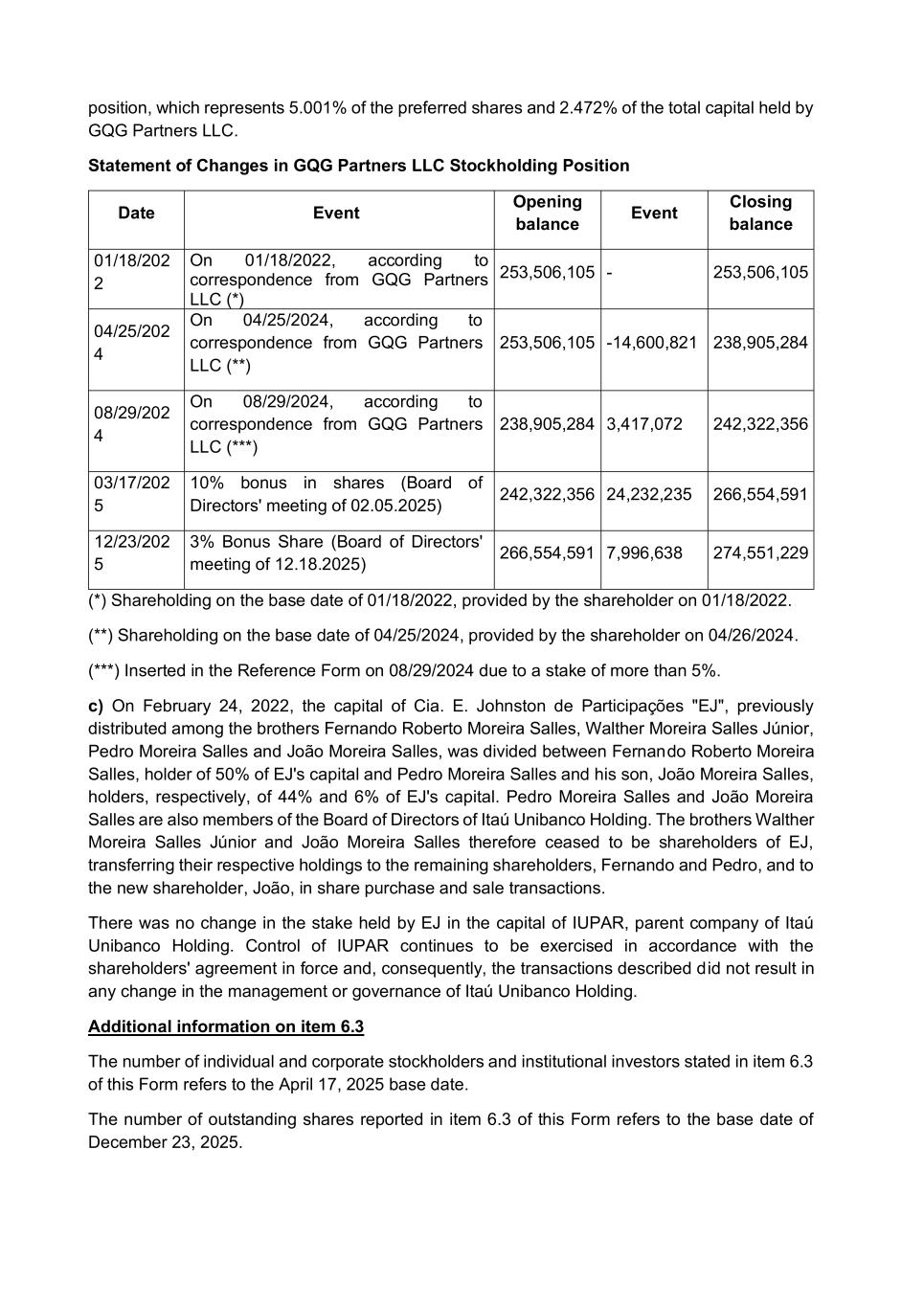 position, which represents 5.001% of the preferred shares and 2.472% of the total capital held by GQG Partners LLC. Statement of Changes in GQG Partners LLC Stockholding Position Date Event Opening balance Event Closing balance 01/18/202 2 On 01/18/2022, according to correspondence from GQG Partners LLC (*) 253,506,105 - 253,506,105 04/25/202 4 On 04/25/2024, according to correspondence from GQG Partners LLC (**) 253,506,105 -14,600,821 238,905,284 08/29/202 4 On 08/29/2024, according to correspondence from GQG Partners LLC (***) 238,905,284 3,417,072 242,322,356 03/17/202 5 10% bonus in shares (Board of Directors' meeting of 02.05.2025) 242,322,356 24,232,235 266,554,591 12/23/202 5 3% Bonus Share (Board of Directors' meeting of 12.18.2025) 266,554,591 7,996,638 274,551,229 (*) Shareholding on the base date of 01/18/2022, provided by the shareholder on 01/18/2022. (**) Shareholding on the base date of 04/25/2024, provided by the shareholder on 04/26/2024. (***) Inserted in the Reference Form on 08/29/2024 due to a stake of more than 5%. c) On February 24, 2022, the capital of Cia. E. Johnston de Participações "EJ", previously distributed among the brothers Fernando Roberto Moreira Salles, Walther Moreira Salles Júnior, Pedro Moreira Salles and João Moreira Salles, was divided between Fernando Roberto Moreira Salles, holder of 50% of EJ's capital and Pedro Moreira Salles and his son, João Moreira Salles, holders, respectively, of 44% and 6% of EJ's capital. Pedro Moreira Salles and João Moreira Salles are also members of the Board of Directors of Itaú Unibanco Holding. The brothers Walther Moreira Salles Júnior and João Moreira Salles therefore ceased to be shareholders of EJ, transferring their respective holdings to the remaining shareholders, Fernando and Pedro, and to the new shareholder, João, in share purchase and sale transactions. There was no change in the stake held by EJ in the capital of IUPAR, parent company of Itaú Unibanco Holding. Control of IUPAR continues to be exercised in accordance with the shareholders' agreement in force and, consequently, the transactions described did not result in any change in the management or governance of Itaú Unibanco Holding. Additional information on item 6.3 The number of individual and corporate stockholders and institutional investors stated in item 6.3 of this Form refers to the April 17, 2025 base date. The number of outstanding shares reported in item 6.3 of this Form refers to the base date of December 23, 2025.