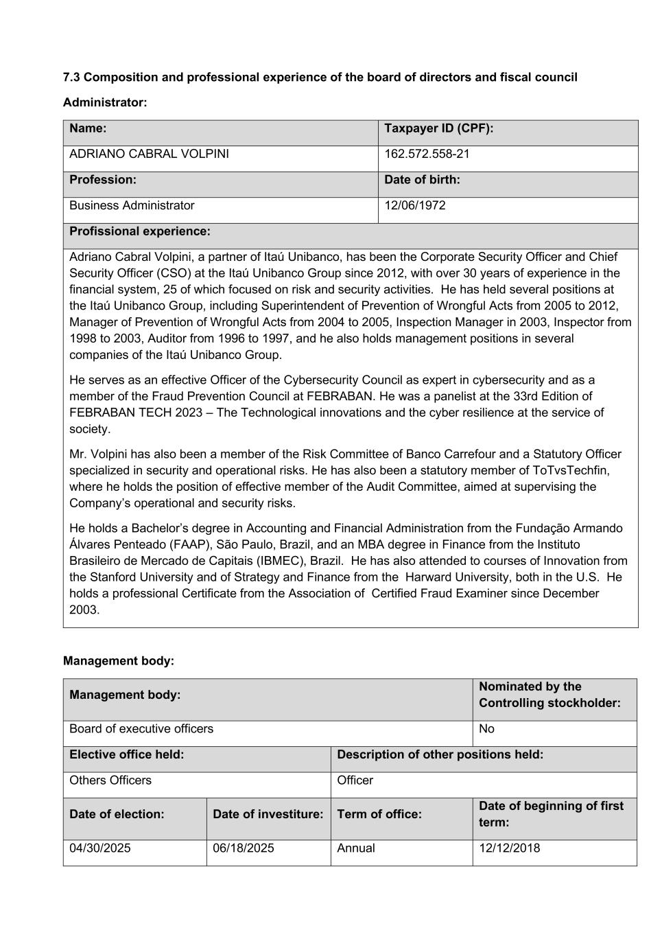 7.3 Composition and professional experience of the board of directors and fiscal council Administrator: Name: Taxpayer ID (CPF): ADRIANO CABRAL VOLPINI 162.572.558-21 Profession: Date of birth: Business Administrator 12/06/1972 Profissional experience: Adriano Cabral Volpini, a partner of Itaú Unibanco, has been the Corporate Security Officer and Chief Security Officer (CSO) at the Itaú Unibanco Group since 2012, with over 30 years of experience in the financial system, 25 of which focused on risk and security activities. He has held several positions at the Itaú Unibanco Group, including Superintendent of Prevention of Wrongful Acts from 2005 to 2012, Manager of Prevention of Wrongful Acts from 2004 to 2005, Inspection Manager in 2003, Inspector from 1998 to 2003, Auditor from 1996 to 1997, and he also holds management positions in several companies of the Itaú Unibanco Group. He serves as an effective Officer of the Cybersecurity Council as expert in cybersecurity and as a member of the Fraud Prevention Council at FEBRABAN. He was a panelist at the 33rd Edition of FEBRABAN TECH 2023 – The Technological innovations and the cyber resilience at the service of society. Mr. Volpini has also been a member of the Risk Committee of Banco Carrefour and a Statutory Officer specialized in security and operational risks. He has also been a statutory member of ToTvsTechfin, where he holds the position of effective member of the Audit Committee, aimed at supervising the Company’s operational and security risks. He holds a Bachelor’s degree in Accounting and Financial Administration from the Fundação Armando Álvares Penteado (FAAP), São Paulo, Brazil, and an MBA degree in Finance from the Instituto Brasileiro de Mercado de Capitais (IBMEC), Brazil. He has also attended to courses of Innovation from the Stanford University and of Strategy and Finance from the Harward University, both in the U.S. He holds a professional Certificate from the Association of Certified Fraud Examiner since December 2003. Management body: Management body: Nominated by the Controlling stockholder: Board of executive officers No Elective office held: Description of other positions held: Others Officers Officer Date of election: Date of investiture: Term of office: Date of beginning of first term: 04/30/2025 06/18/2025 Annual 12/12/2018