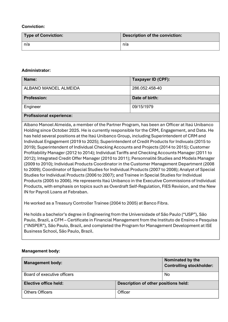 Conviction: Type of Conviction: Description of the conviction: n/a n/a Administrator: Name: Taxpayer ID (CPF): ALBANO MANOEL ALMEIDA 286.052.458-40 Profession: Date of birth: Engineer 09/15/1979 Profissional experience: Albano Manoel Almeida, a member of the Partner Program, has been an Officer at Itaú Unibanco Holding since October 2025. He is currently responsible for the CRM, Engagement, and Data. He has held several positions at the Itaú Unibanco Group, including Superintendent of CRM and Individual Engagement (2019 to 2025); Superintendent of Credit Products for Indivuals (2015 to 2019); Superintendent of Individual Checking Accounts and Projects (2014 to 2015); Customer Profitability Manager (2012 to 2014); Individual Tariffs and Checking Accounts Manager (2011 to 2012); Integrated Credit Offer Manager (2010 to 2011); Personnalité Studies and Models Manager (2009 to 2010); Individual Products Coordinator in the Customer Management Department (2008 to 2009); Coordinator of Special Studies for Individual Products (2007 to 2008); Analyst of Special Studies for Individual Products (2006 to 2007); and Trainee in Special Studies for Individual Products (2005 to 2006). He represents Itaú Unibanco in the Executive Commissions of Individual Products, with emphasis on topics such as Overdraft Self-Regulation, FIES Revision, and the New IN for Payroll Loans at Febraban. He worked as a Treasury Controller Trainee (2004 to 2005) at Banco Fibra. He holds a bachelor’s degree in Engineering from the Universidade of São Paulo (“USP”), São Paulo, Brazil, a CFM – Certificate in Financial Management from the Instituto de Ensino e Pesquisa (“INSPER”), São Paulo, Brazil, and completed the Program for Management Development at ISE Business School, São Paulo, Brazil. Management body: Management body: Nominated by the Controlling stockholder: Board of executive officers No Elective office held: Description of other positions held: Others Officers Officer