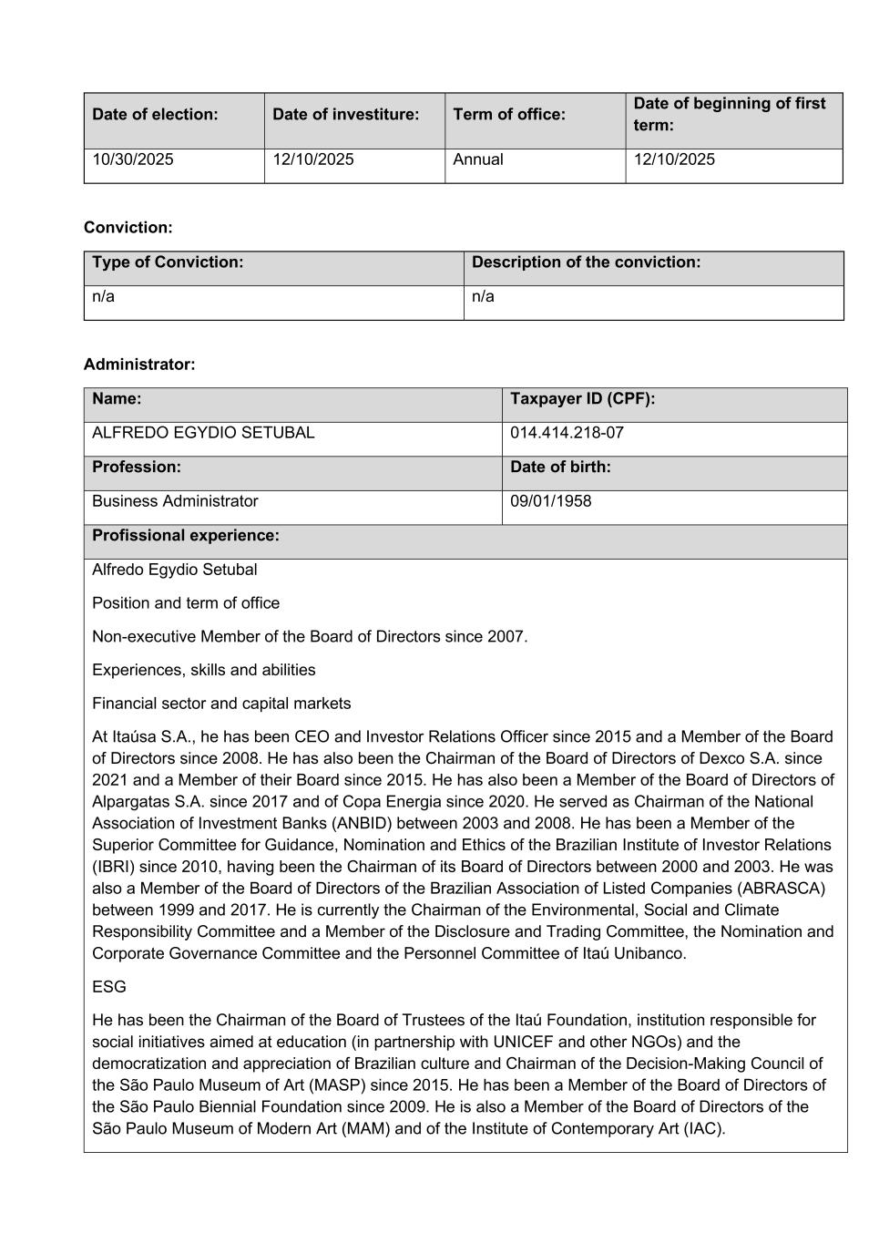 Date of election: Date of investiture: Term of office: Date of beginning of first term: 10/30/2025 12/10/2025 Annual 12/10/2025 Conviction: Type of Conviction: Description of the conviction: n/a n/a Administrator: Name: Taxpayer ID (CPF): ALFREDO EGYDIO SETUBAL 014.414.218-07 Profession: Date of birth: Business Administrator 09/01/1958 Profissional experience: Alfredo Egydio Setubal Position and term of office Non-executive Member of the Board of Directors since 2007. Experiences, skills and abilities Financial sector and capital markets At Itaúsa S.A., he has been CEO and Investor Relations Officer since 2015 and a Member of the Board of Directors since 2008. He has also been the Chairman of the Board of Directors of Dexco S.A. since 2021 and a Member of their Board since 2015. He has also been a Member of the Board of Directors of Alpargatas S.A. since 2017 and of Copa Energia since 2020. He served as Chairman of the National Association of Investment Banks (ANBID) between 2003 and 2008. He has been a Member of the Superior Committee for Guidance, Nomination and Ethics of the Brazilian Institute of Investor Relations (IBRI) since 2010, having been the Chairman of its Board of Directors between 2000 and 2003. He was also a Member of the Board of Directors of the Brazilian Association of Listed Companies (ABRASCA) between 1999 and 2017. He is currently the Chairman of the Environmental, Social and Climate Responsibility Committee and a Member of the Disclosure and Trading Committee, the Nomination and Corporate Governance Committee and the Personnel Committee of Itaú Unibanco. ESG He has been the Chairman of the Board of Trustees of the Itaú Foundation, institution responsible for social initiatives aimed at education (in partnership with UNICEF and other NGOs) and the democratization and appreciation of Brazilian culture and Chairman of the Decision-Making Council of the São Paulo Museum of Art (MASP) since 2015. He has been a Member of the Board of Directors of the São Paulo Biennial Foundation since 2009. He is also a Member of the Board of Directors of the São Paulo Museum of Modern Art (MAM) and of the Institute of Contemporary Art (IAC).