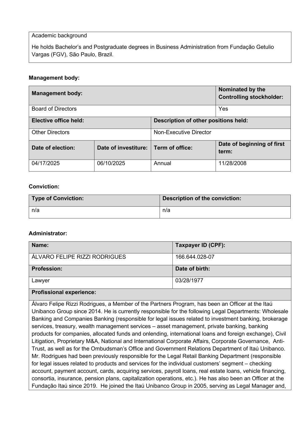 Academic background He holds Bachelor’s and Postgraduate degrees in Business Administration from Fundação Getulio Vargas (FGV), São Paulo, Brazil. Management body: Management body: Nominated by the Controlling stockholder: Board of Directors Yes Elective office held: Description of other positions held: Other Directors Non-Executive Director Date of election: Date of investiture: Term of office: Date of beginning of first term: 04/17/2025 06/10/2025 Annual 11/28/2008 Conviction: Type of Conviction: Description of the conviction: n/a n/a Administrator: Name: Taxpayer ID (CPF): ÁLVARO FELIPE RIZZI RODRIGUES 166.644.028-07 Profession: Date of birth: Lawyer 03/28/1977 Profissional experience: Álvaro Felipe Rizzi Rodrigues, a Member of the Partners Program, has been an Officer at the Itaú Unibanco Group since 2014. He is currently responsible for the following Legal Departments: Wholesale Banking and Companies Banking (responsible for legal issues related to investment banking, brokerage services, treasury, wealth management services – asset management, private banking, banking products for companies, allocated funds and onlending, international loans and foreign exchange), Civil Litigation, Proprietary M&A, National and International Corporate Affairs, Corporate Governance, Anti- Trust, as well as for the Ombudsman’s Office and Government Relations Department of Itaú Unibanco. Mr. Rodrigues had been previously responsible for the Legal Retail Banking Department (responsible for legal issues related to products and services for the individual customers’ segment – checking account, payment account, cards, acquiring services, payroll loans, real estate loans, vehicle financing, consortia, insurance, pension plans, capitalization operations, etc.). He has also been an Officer at the Fundação Itaú since 2019. He joined the Itaú Unibanco Group in 2005, serving as Legal Manager and,